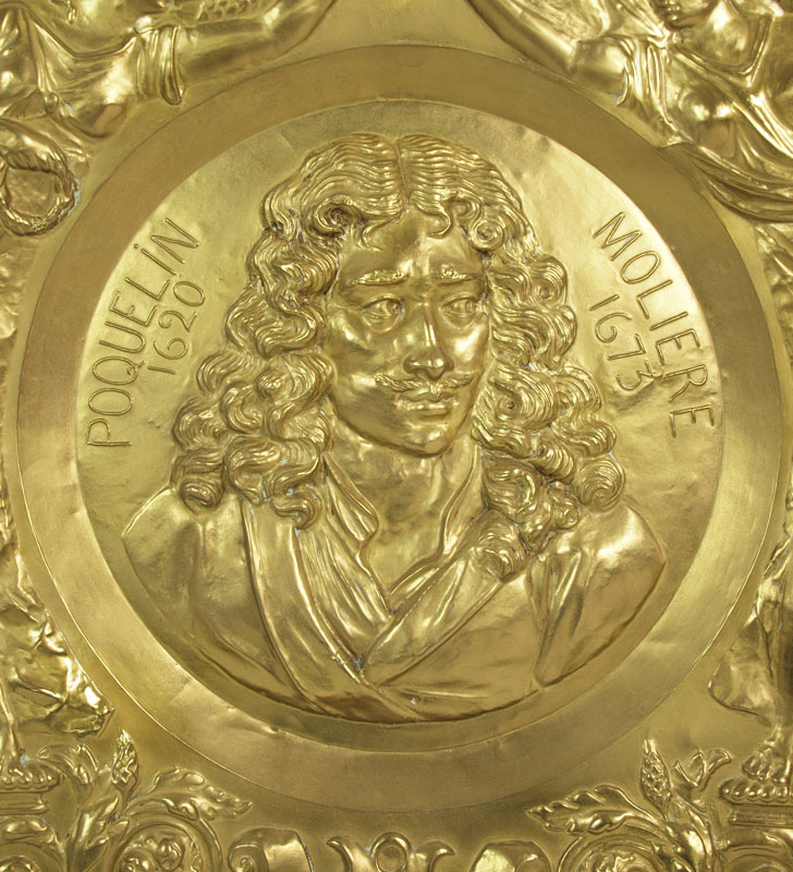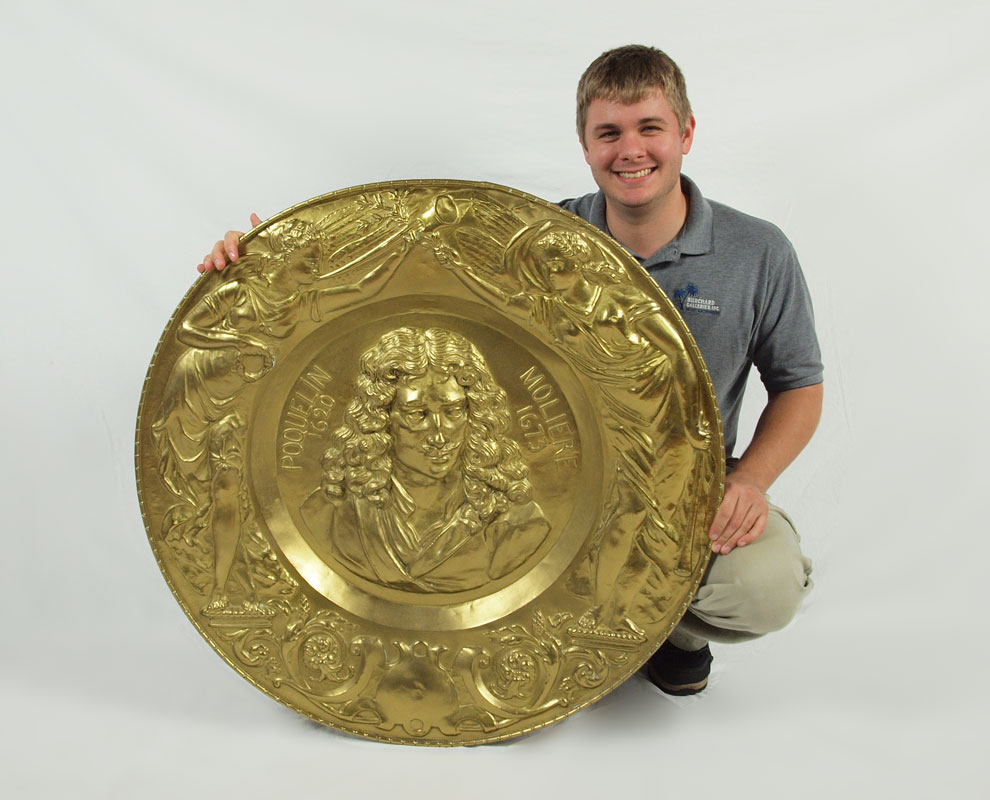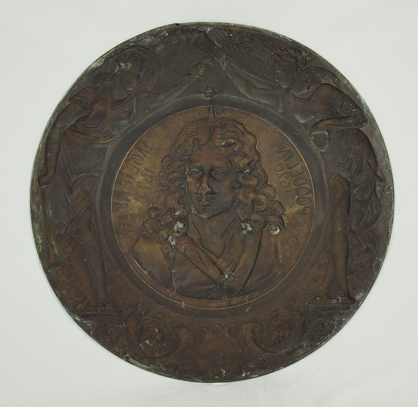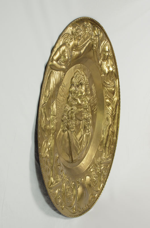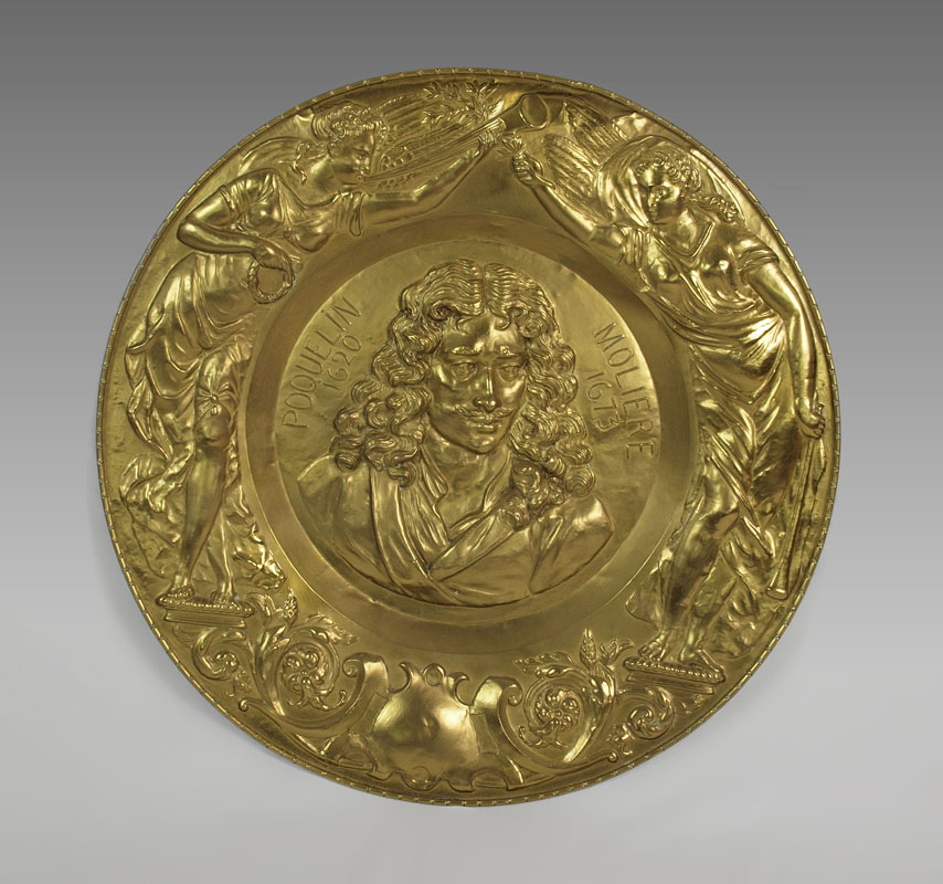 LARGE 38'' DIA. BRASS CHARGER: In the 17th century style. The center embossed with the image of the French actor and playwright Jean Baptiste Poquelin, known as Moliere.