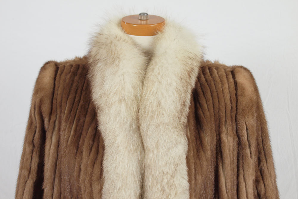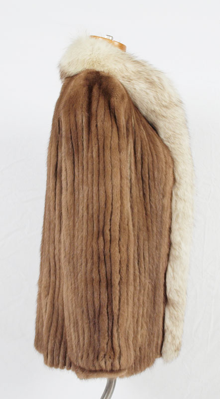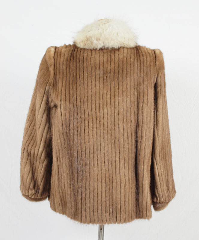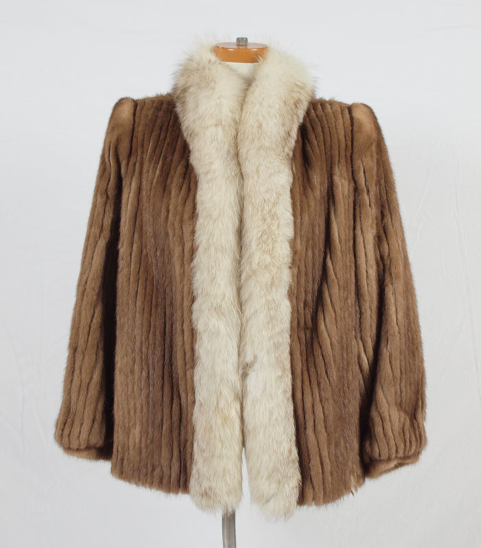 MINK FUR JACKET WITH SILVER FOX FUR COLLAR & TRIM: Thin pelts in a striped effect. Size 16, approx. 28'' tall.