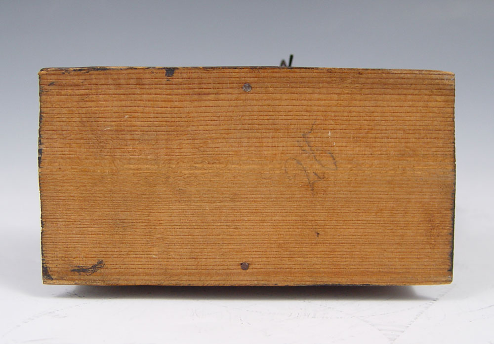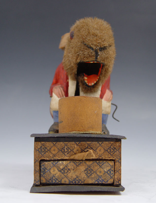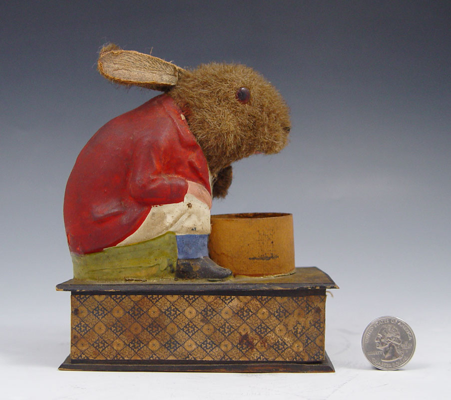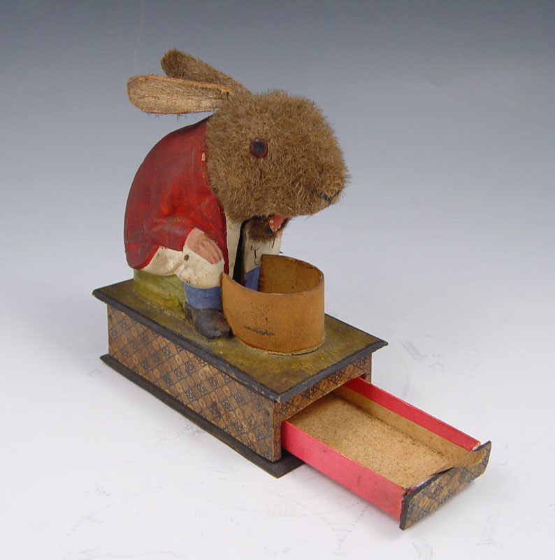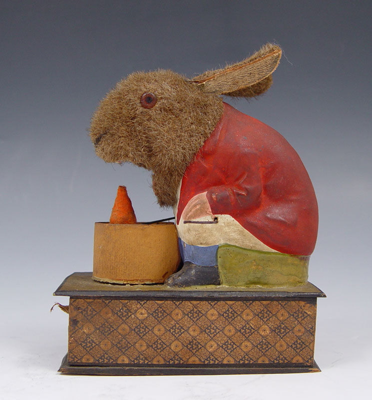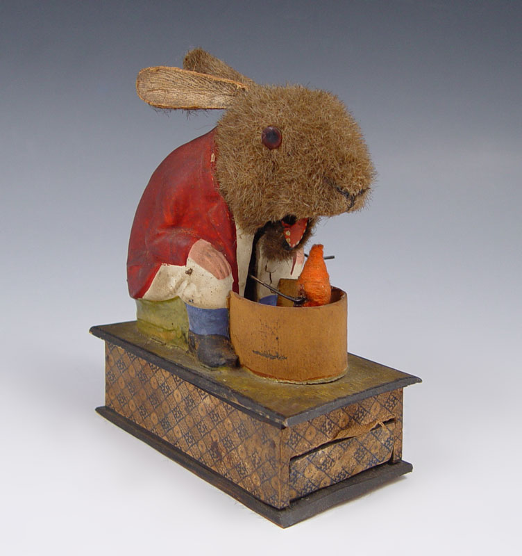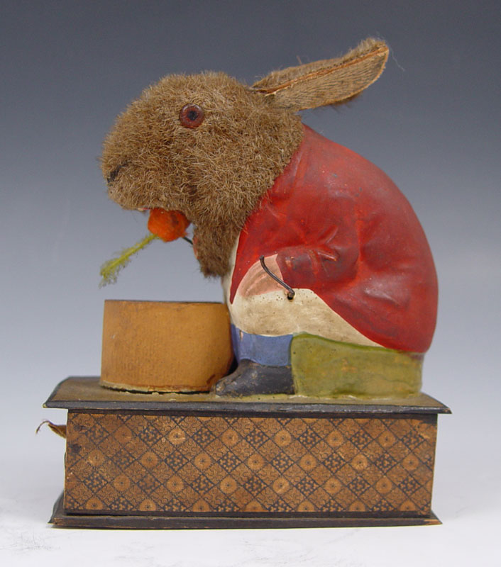 BUNNY EATING THE REVOLVING CARROT VINTAGE TOY: Mohair rabbit with paper mache body which appears to be eating carrot when side crank rotated, ears move when hit by carrot. Sits on single drawer jewelry or coin box. All original. 5 1/4'' x 4 3/4'' x 2 1/2''.