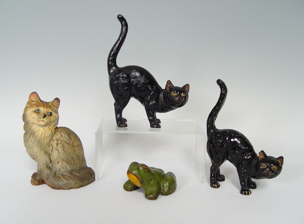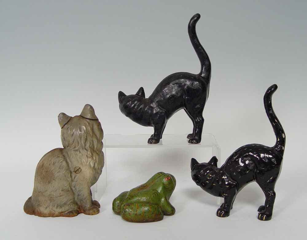 4 CAST IRON DOORSTOPS- 3 CATS AND A FROG: Black cats are modern production. White cat measures 8 3/4'' h. x 6'' x 4''.