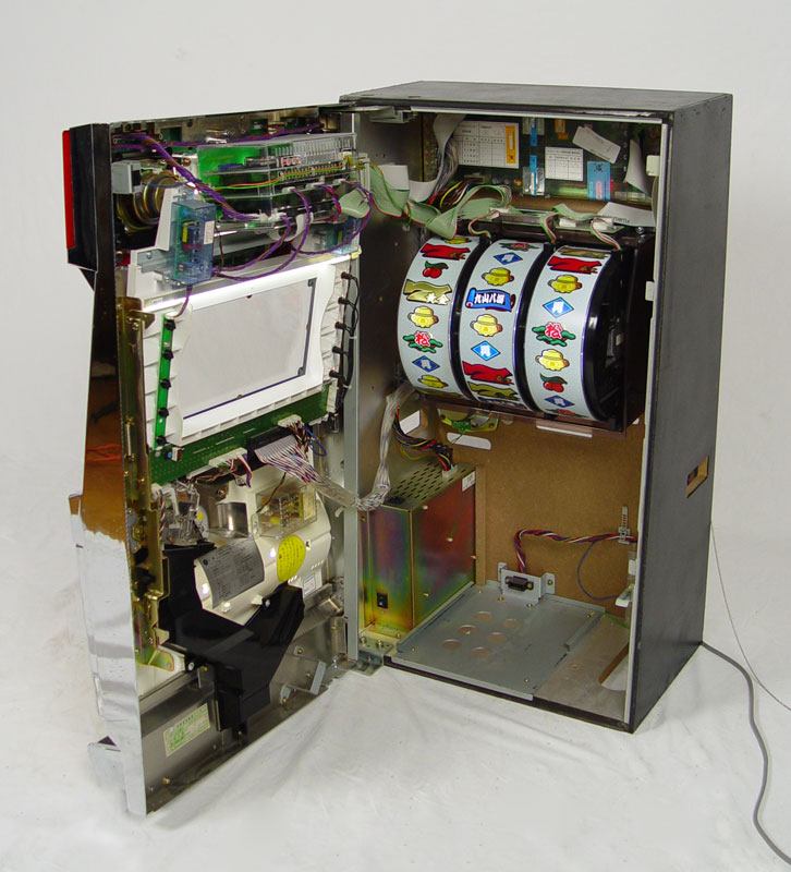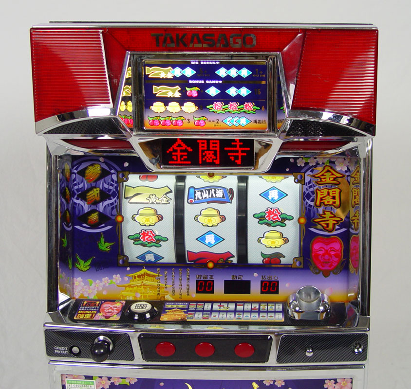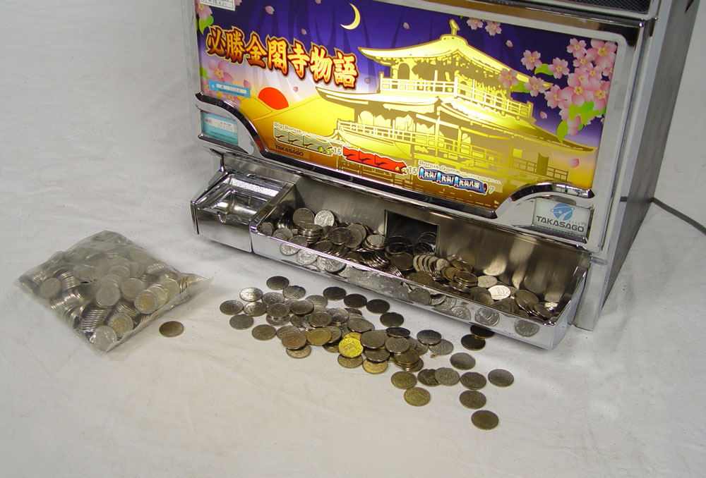 TAKASAGO JAPANESE SLOT MACHINE: Set up for token, not coin play, currently in working condition. Measures 32'' x 18 1/2'' x 15''. Hundreds of tokens included.