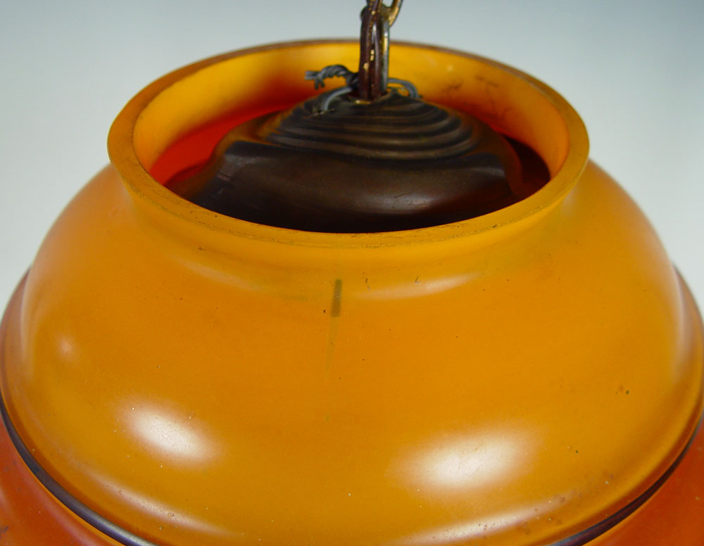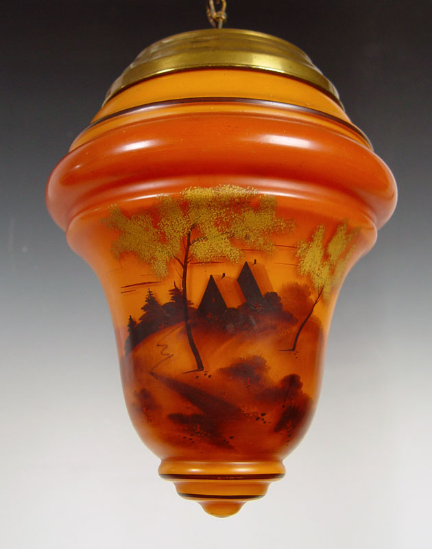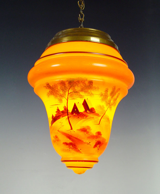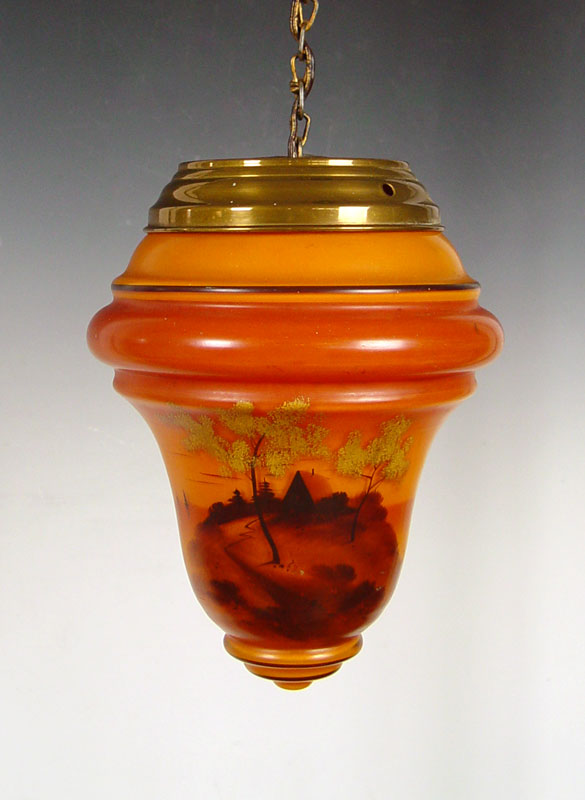 VINTAGE PAINTED GLASS HANGING LIGHT FIXTURE: Hand painted with lakefront scene. 12 1/2'' h. x 9'' dia.