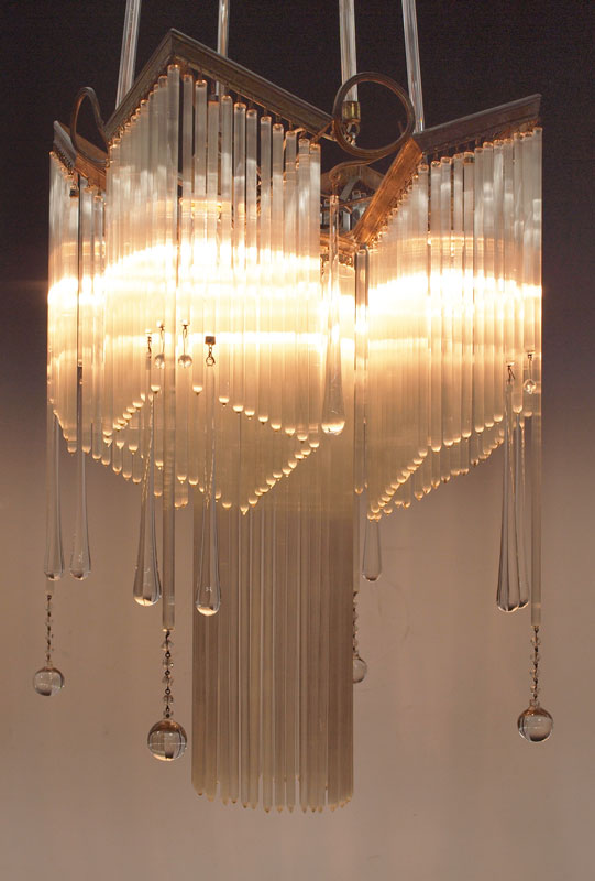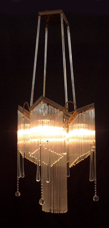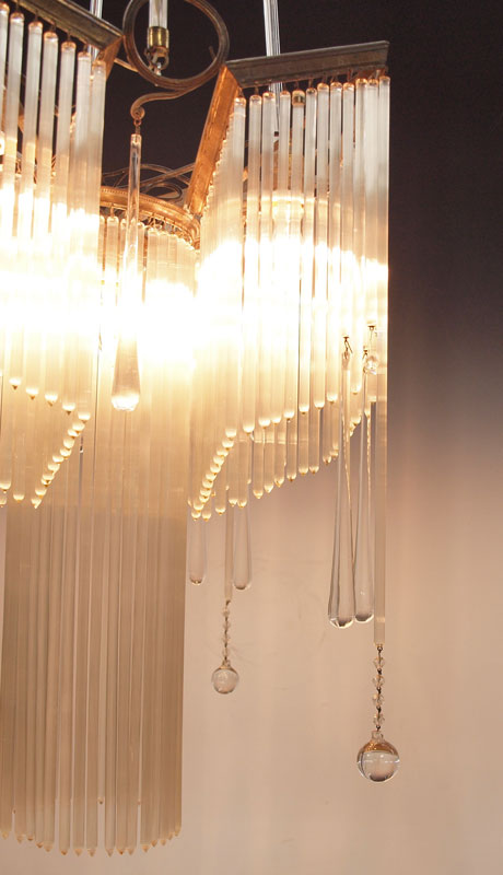 ART DECO CHANDELIER: Square form with crystal rods in an angular placement. In need of TLC. 48'' length, 16'' dia.