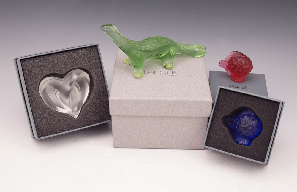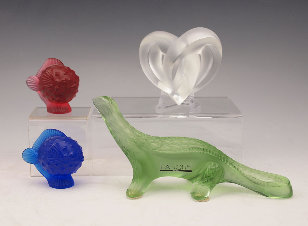 LALIQUE FRENCH CRYSTAL SCULPTURES: To include, 1) Cobalt Sunfish, 2000, with box, pamphlet and check slip; 2) Red Sunfish, 2000, with box, pamphlet and check slip; 3) Coeurs Entrelaces Paperweight, 1998, with box, pamphlet and check slip; 4) Emerald Green Salamander, with box only.