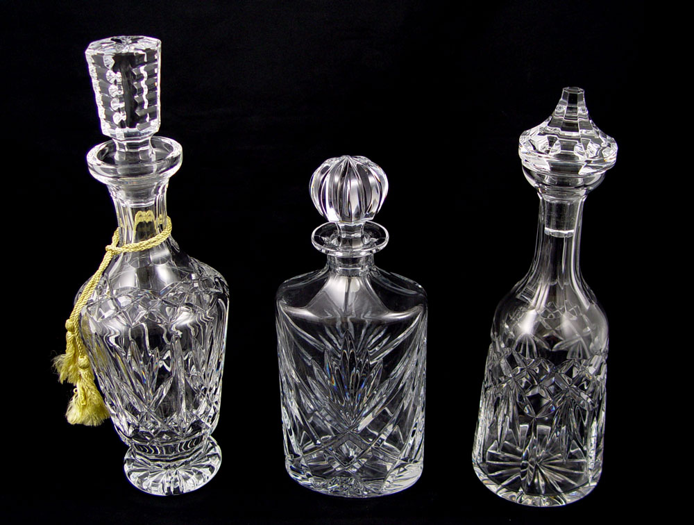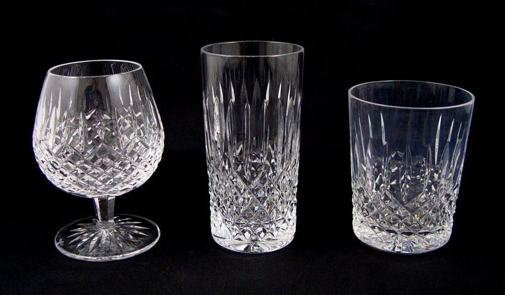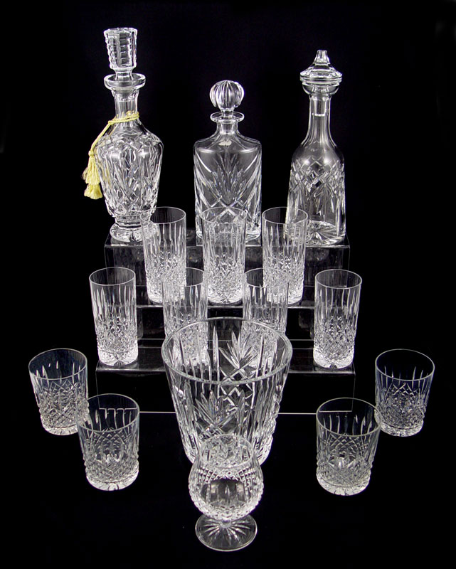 16 PIECE WATERFORD CRYSTAL: To include 3 spirits decanters with stoppers (10- 3 1/2''). An Ice bucket,(11 1/2''h), 4 Ballybay flat tumblers (4 3/8''), 7 Ballybay flat tumblers (5 1/2''), and a brandy glass.