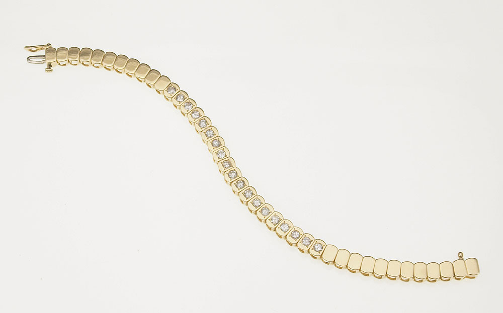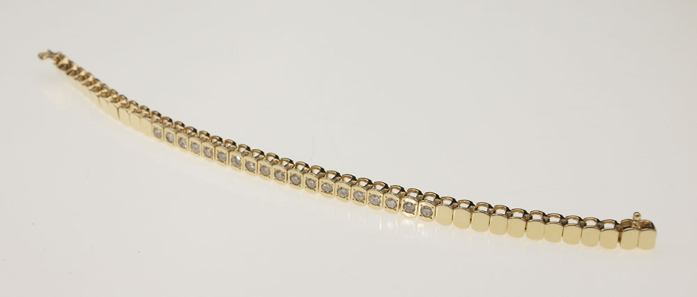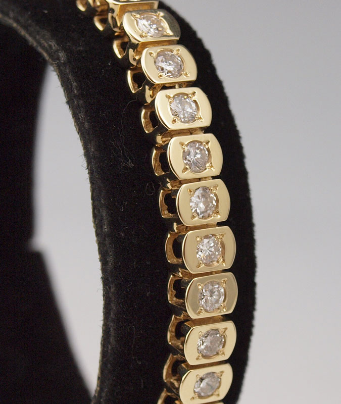 2.28 CT DIAMOND LINE BRACELET: 14K yellow gold bracelet contains 19 round brilliant diamonds rated I1 in clarity and H-I color. Length 7''. Weight 26.8 grams. Sold with current Florida Diamond Appraiser's GIA graduates appraisal for $4,750.