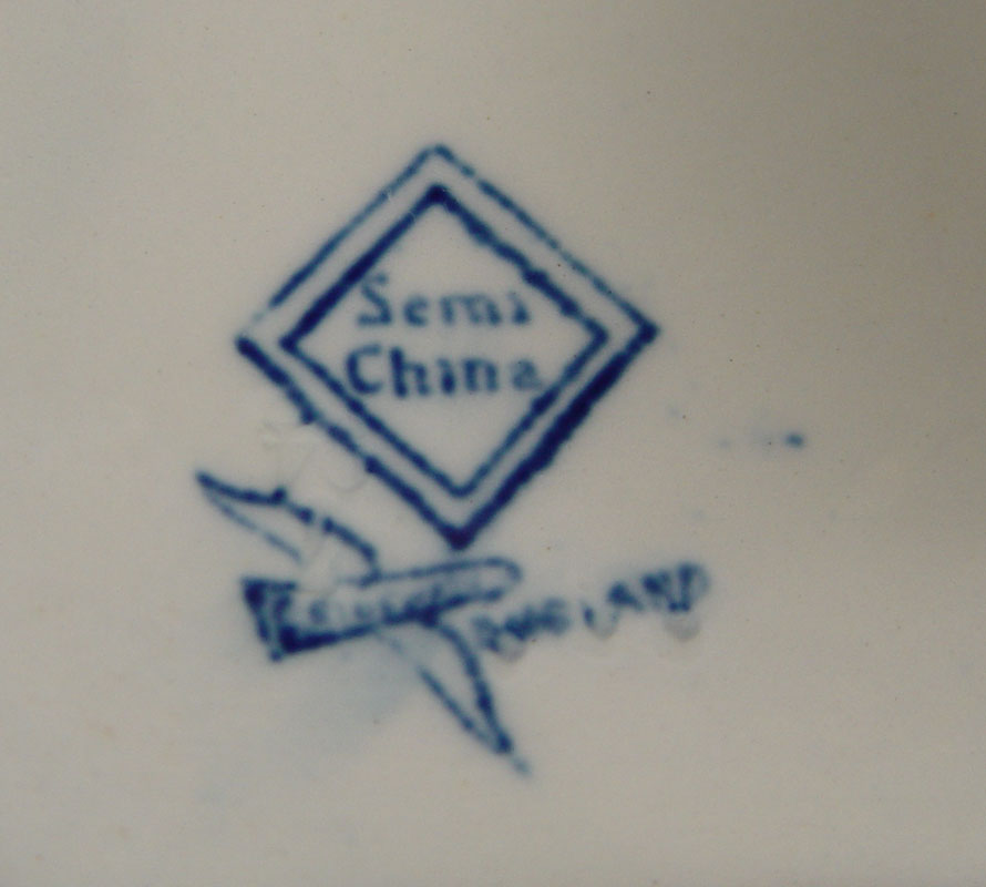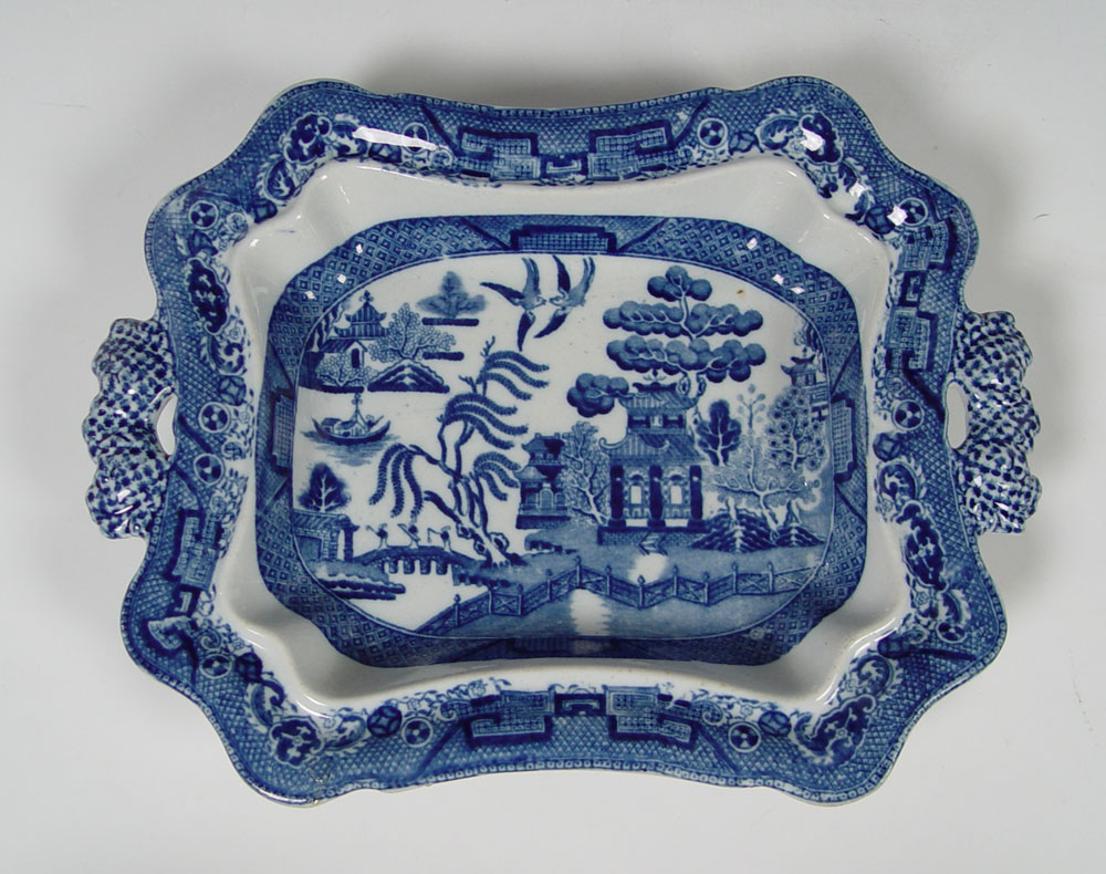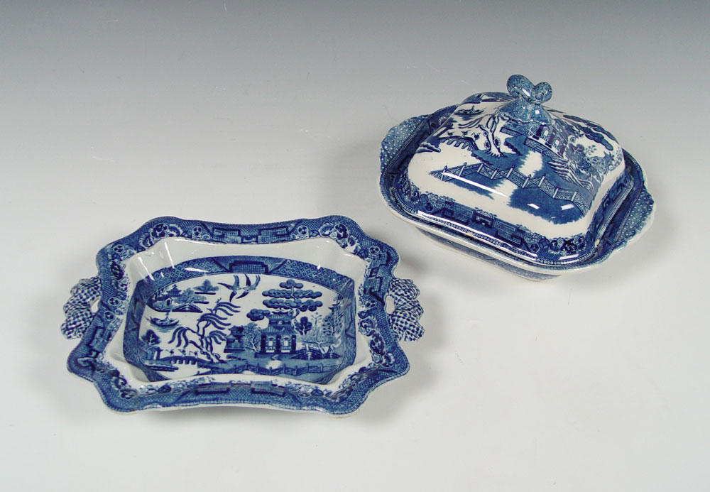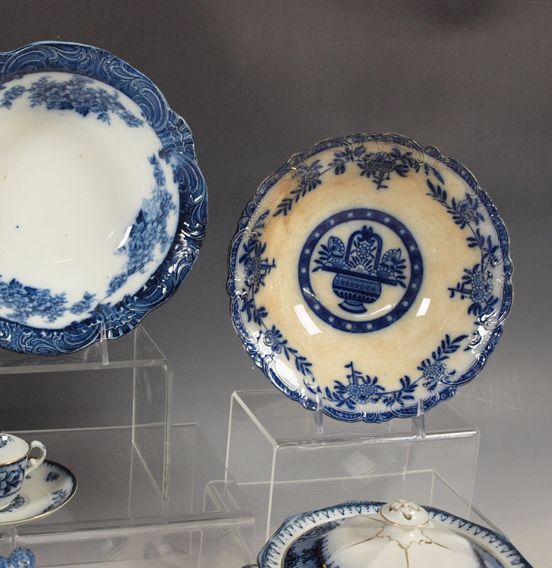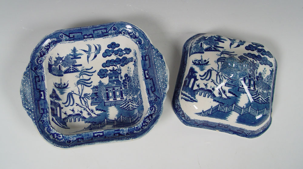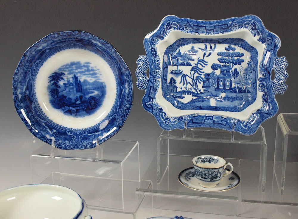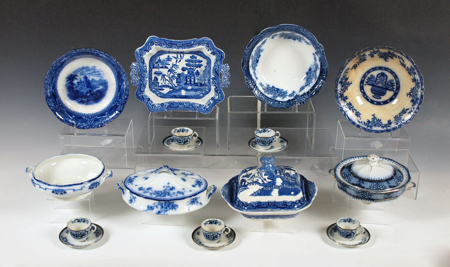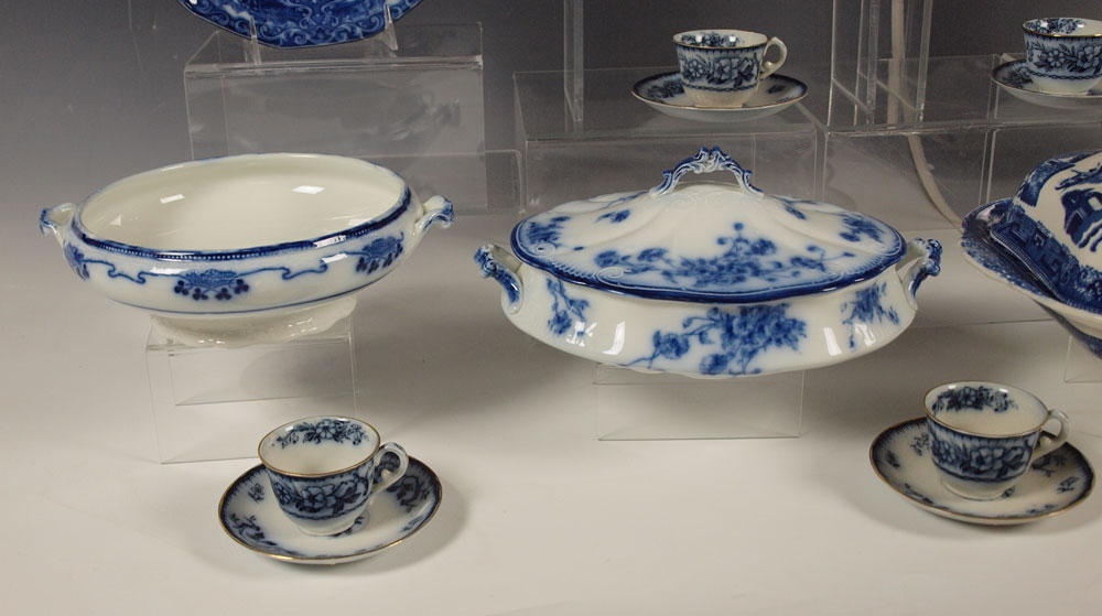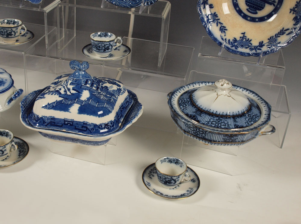 ESTATE GROUP OF ENGLISH FLOW BLUE, BLUE WILLOW & TRANSFERWARE CHINA: 1) Set of 5 Burleigh Ware demi cups & saucers. 2) Lincoln Pottery covered serving dish, 9''. 3) Blue Willow covered vegetable, 11''. 4) Hanley Blue Willow serving dish, 12''l. 5) Staffordshire Bowl, 10'' dia. 6) Wood & Sons Victoria pattern 10' bowl. 7) A 12'' oval covered vegetable. 8) Lorne pattern vegetable (no lid), 10''.