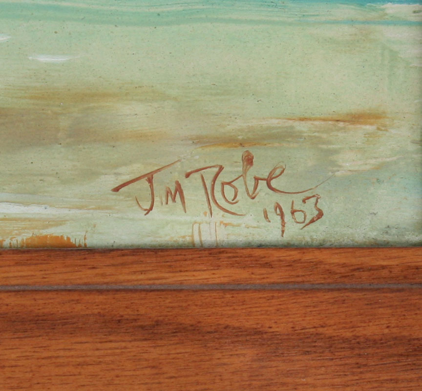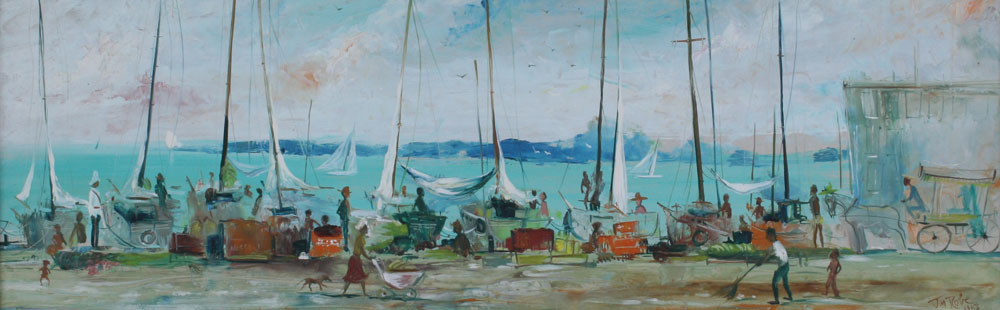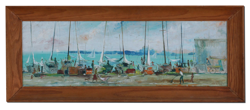 ROBE, Jim, (American, 20th C.): Busy Pier Scene with Figures, Oil/Masonite, 12'' x 36'', signed & dated '63, wood frame, 16 1/2'' x 40 1/2''.