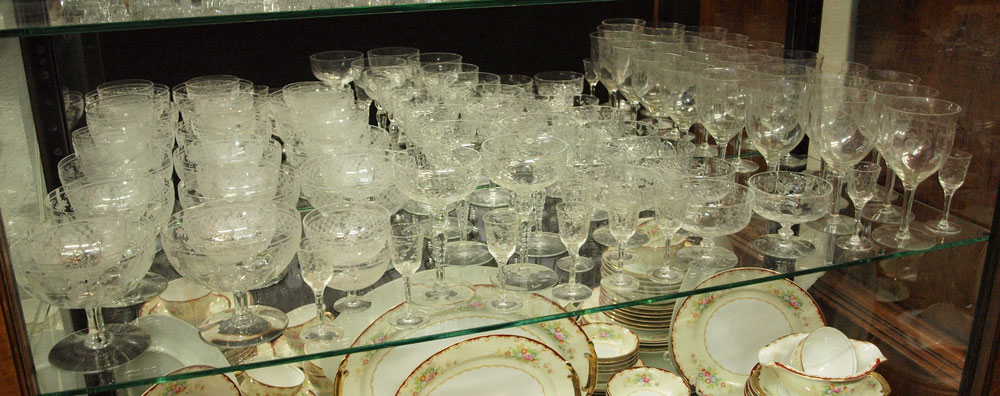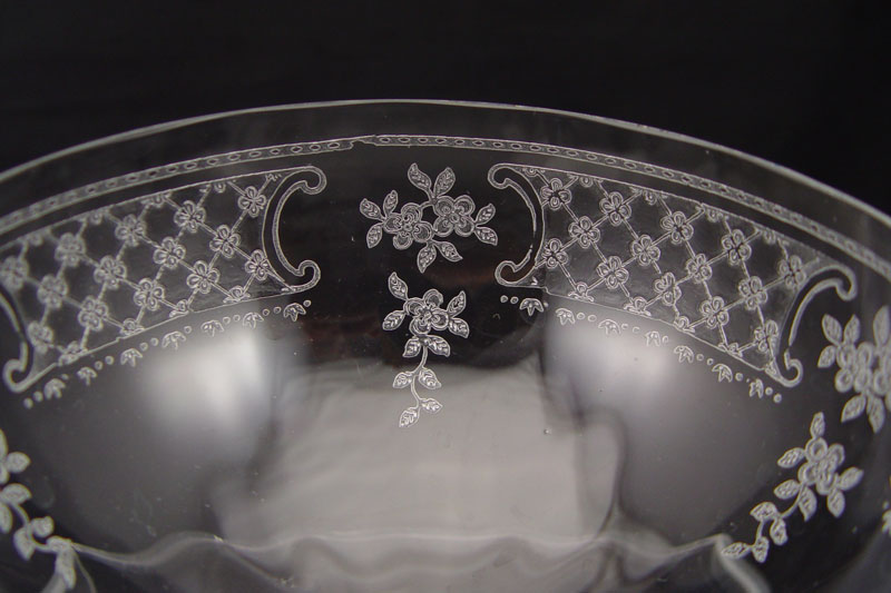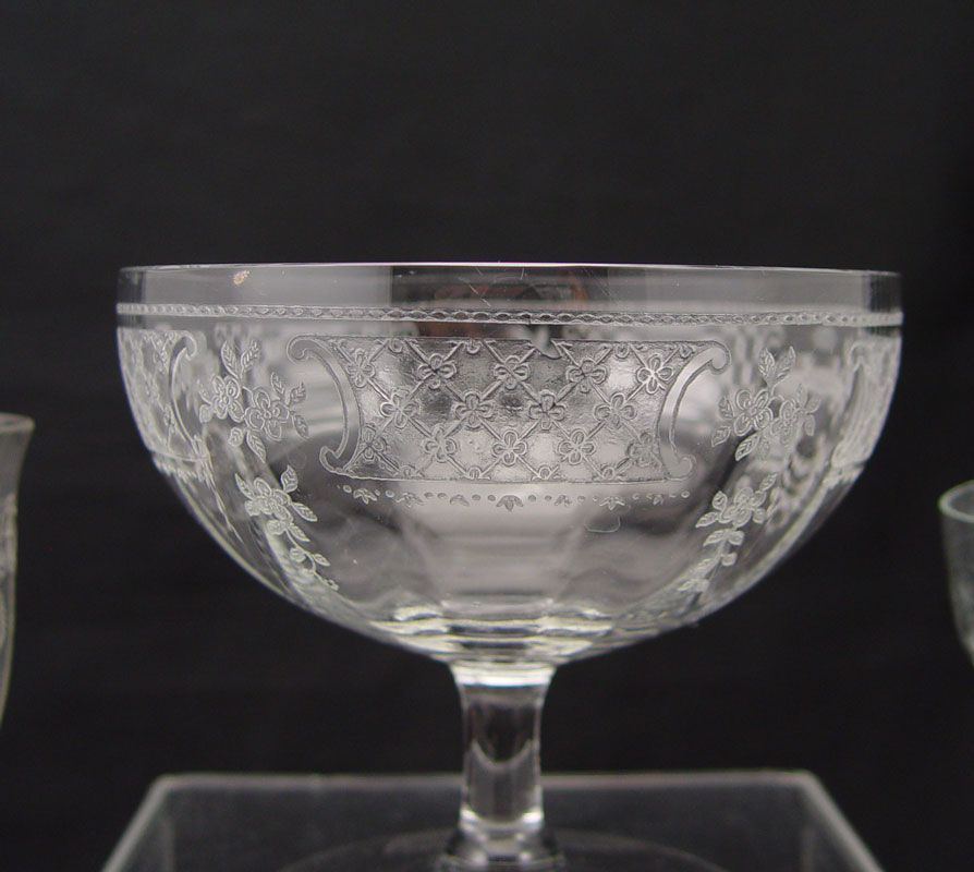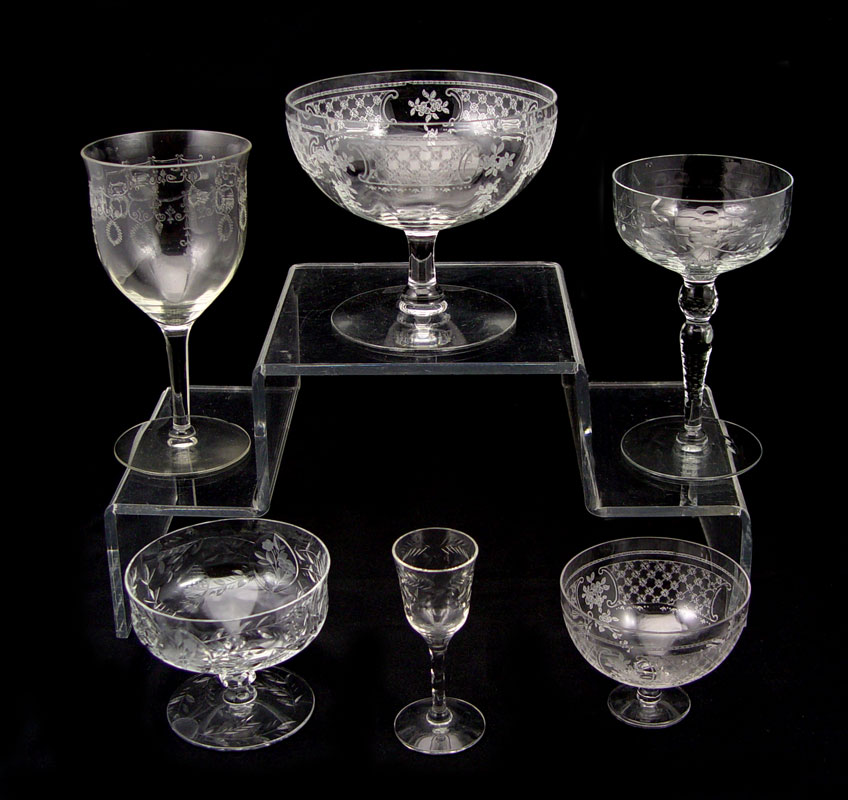 EARLY HIGH QUALITY ETCHED GLASSWARE: Possibly Libby Rock Sharp. Approx 56 pieces, each size a different pattern. 8 SHRIMPERS with underbowls and 2 extra insert bowls, 12 needle etched WATER GOBLETS, 8 WINE stems, and 10 CORDIALS.