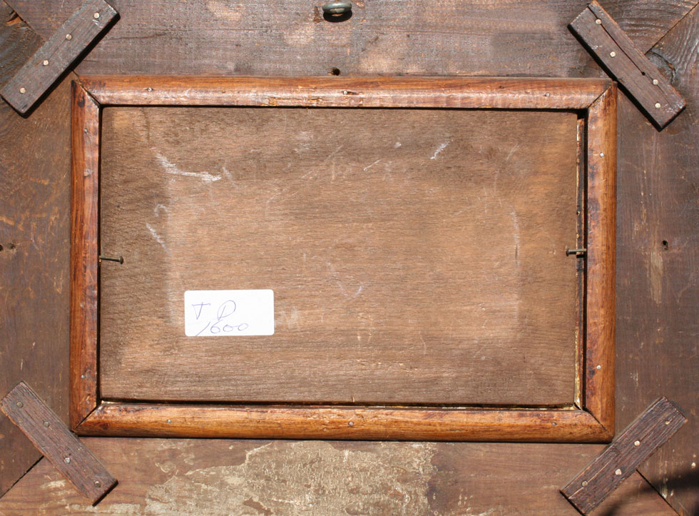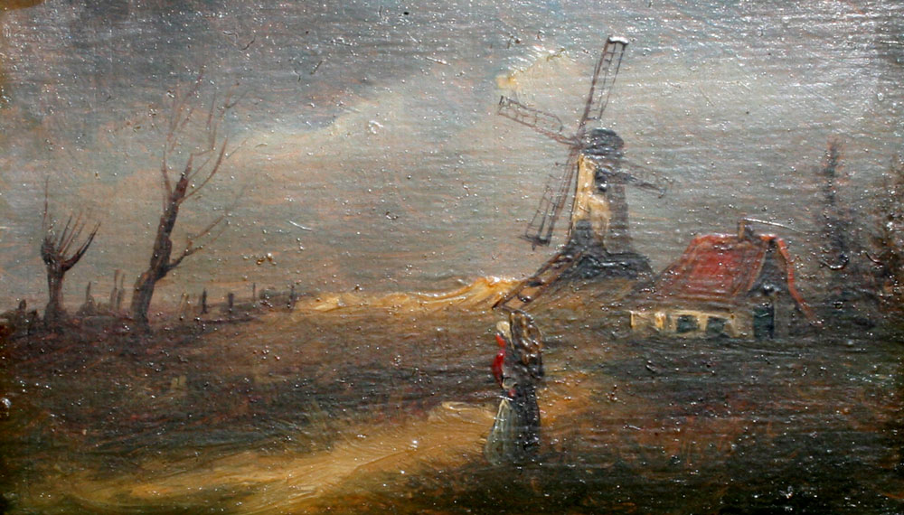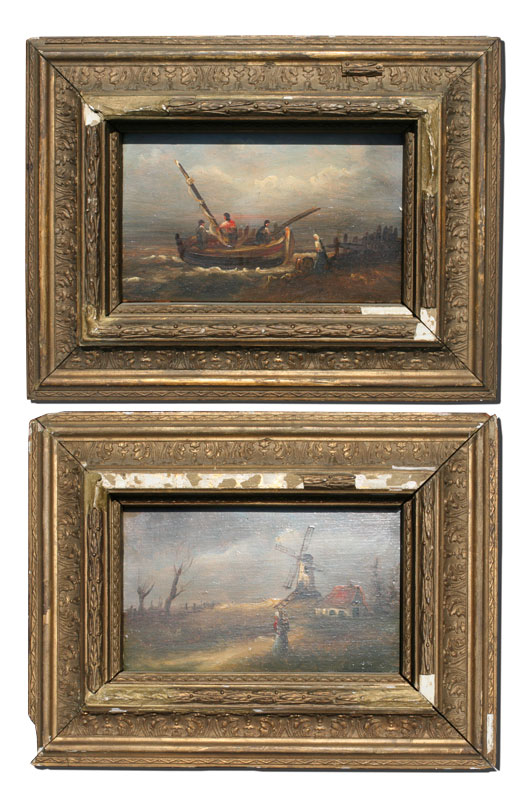 TWO PIECE DUTCH OIL ON BOARD LOT TO INCLUDE FIGURE IN LANDSCAPE WITH A WINDMILL AND SHORELINE SCENE WITH FISHERMAN RETURNING: Both measure 5'' x 8 1/2'', encased in gilded gesso frames with wear and missing gesso, 10 1/2'' x 13 1/2''.