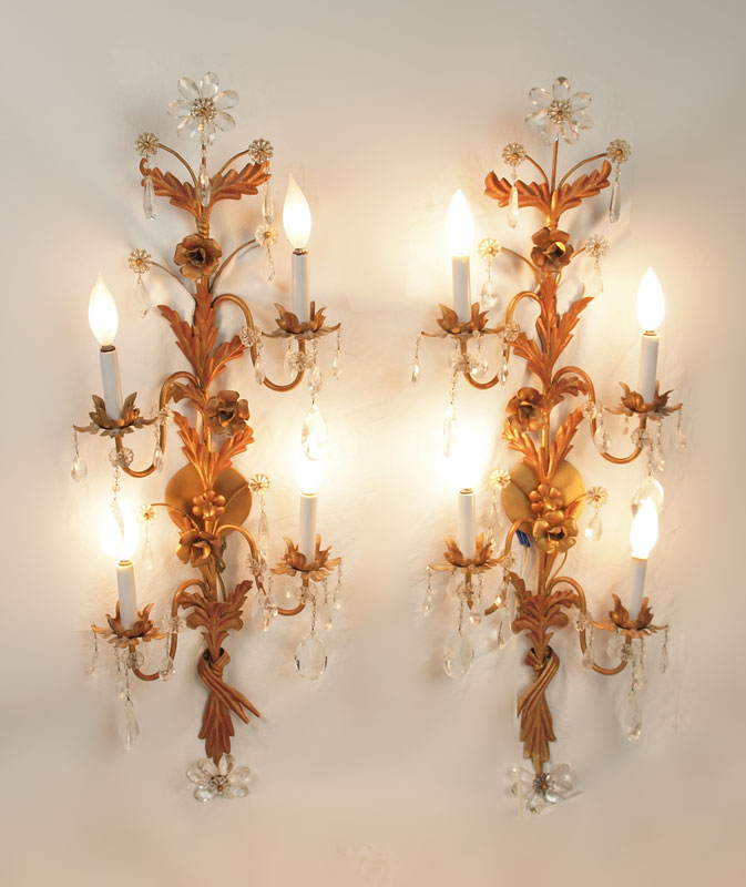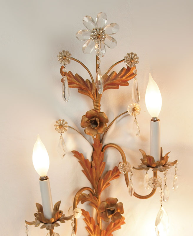 PAIR OF ITALIAN GILT METAL AND CRYSTAL SCONCE LAMPS: Flower and leaf form, approx. 38''l. 12'' wide.