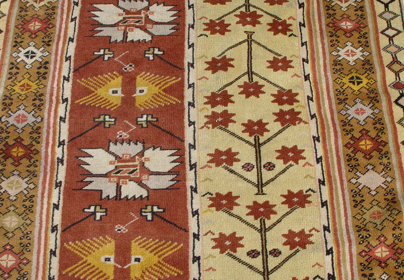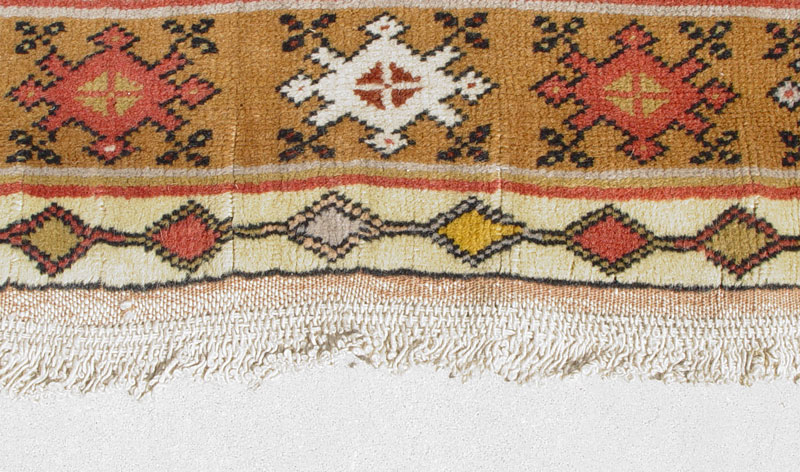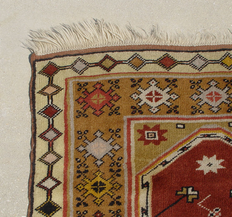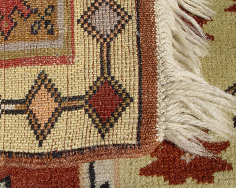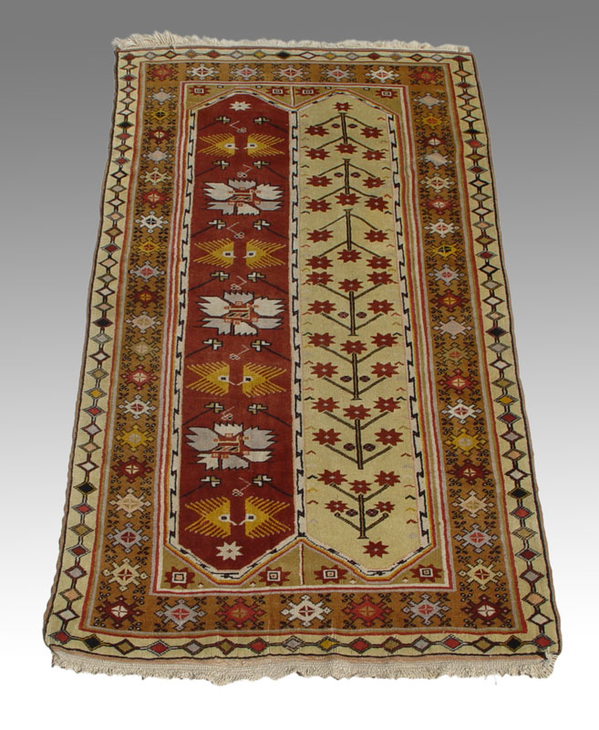 HAND TIED TURKISH RUG: Approx. 7'1'' x 4'1''. Gold, cream and rust, double border.