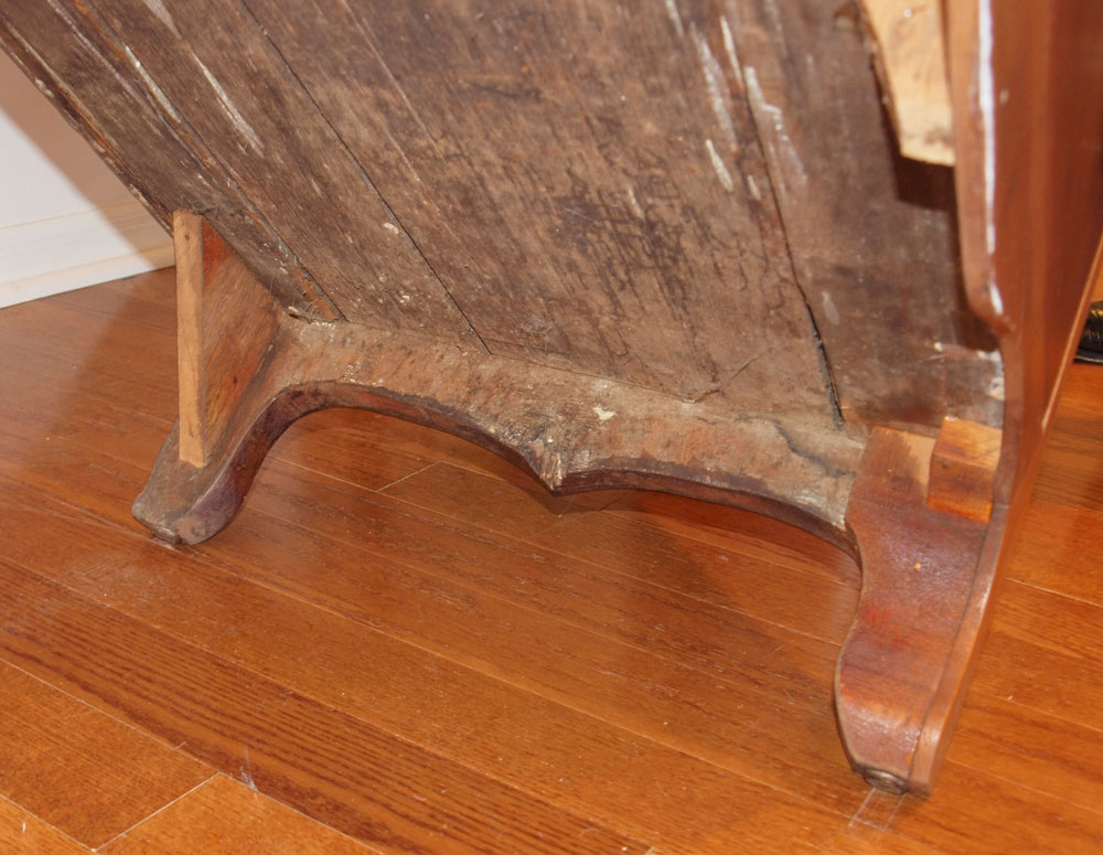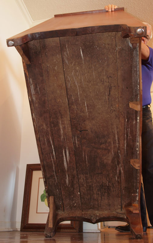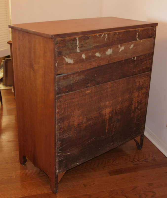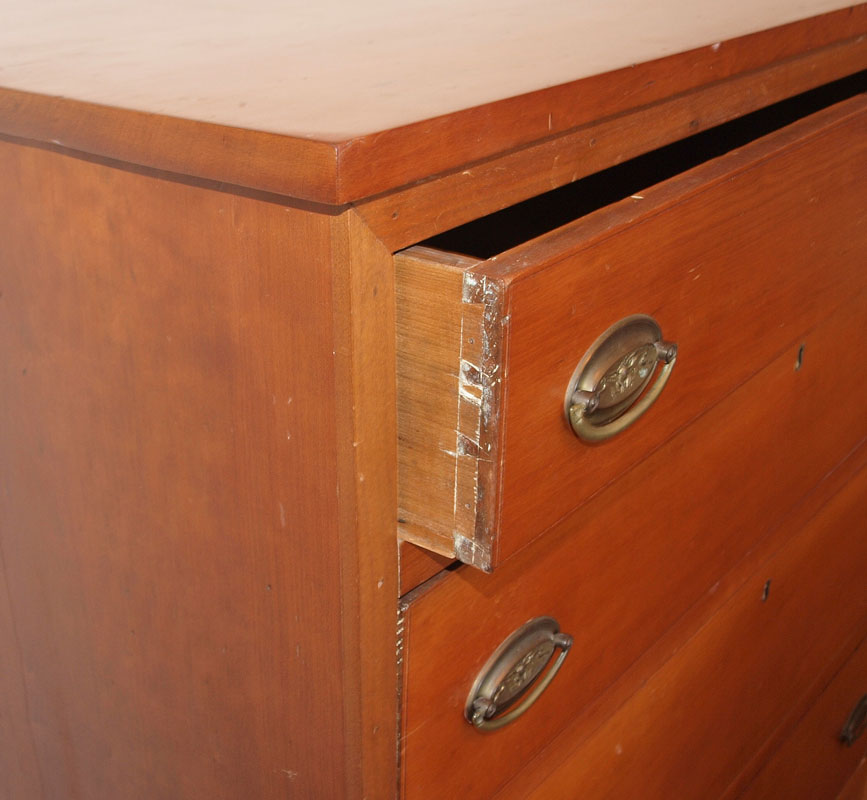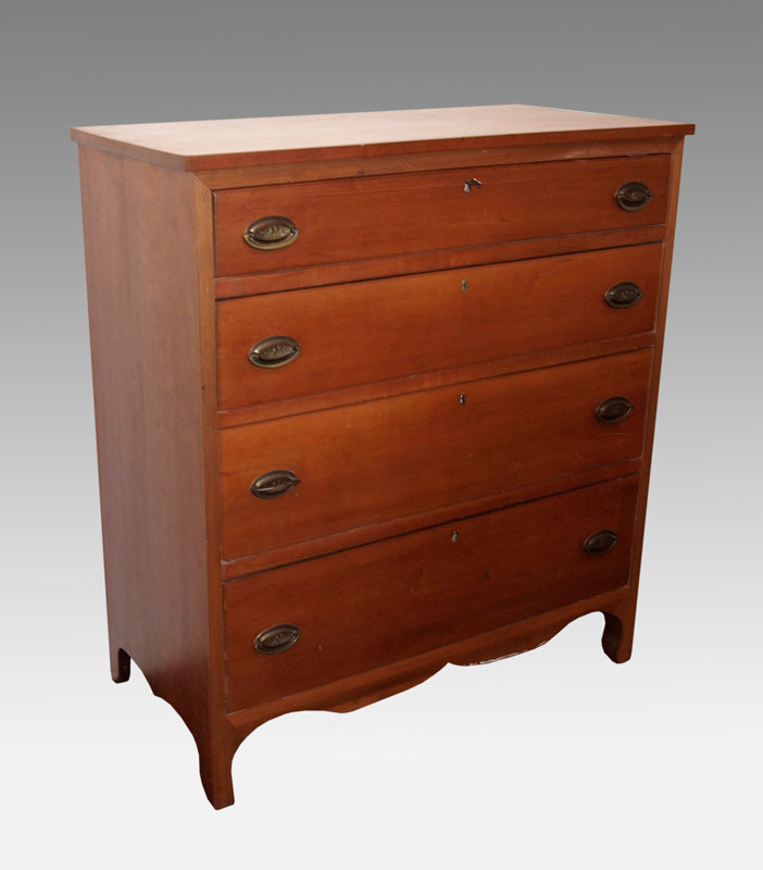 COUNTRY HEPPLEWHITE 4 GRADUATED DRAWER CHEST: Maple with single board ends and cut base, old oval brass drawer pulls with banner and eagle design, older finish, 44''h. x 39 1/2'' x 20''.