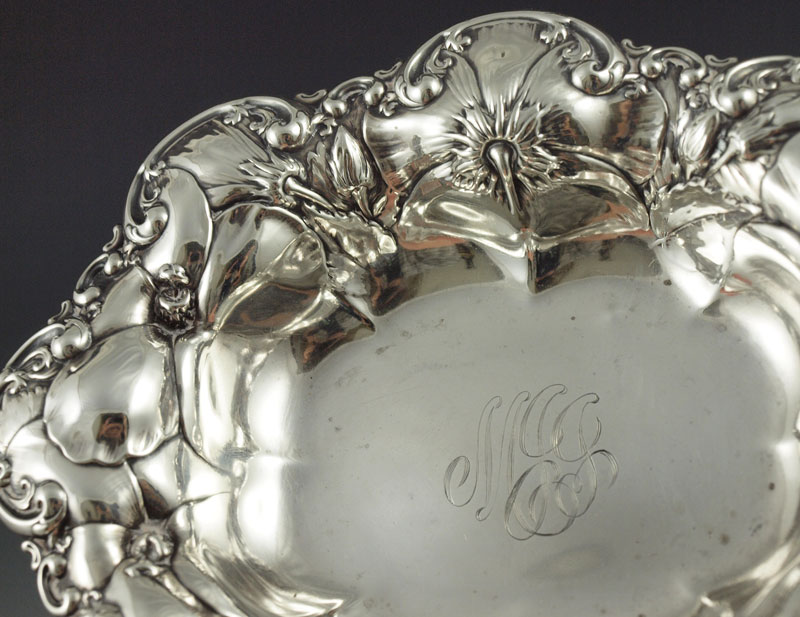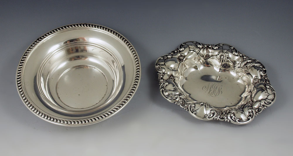 PAIR OF STERLING SILVER BOWLS: To include 1) Whiting repousse floral rim bowl / candy dish. Monogrammed, 1 1/4'' h. x 7'' x 5 5/8''. 2) Newberry Silver Co. bowl with rope twist rim. 1 3/4'' h. x 6 7/8''.