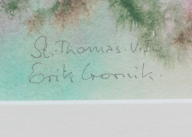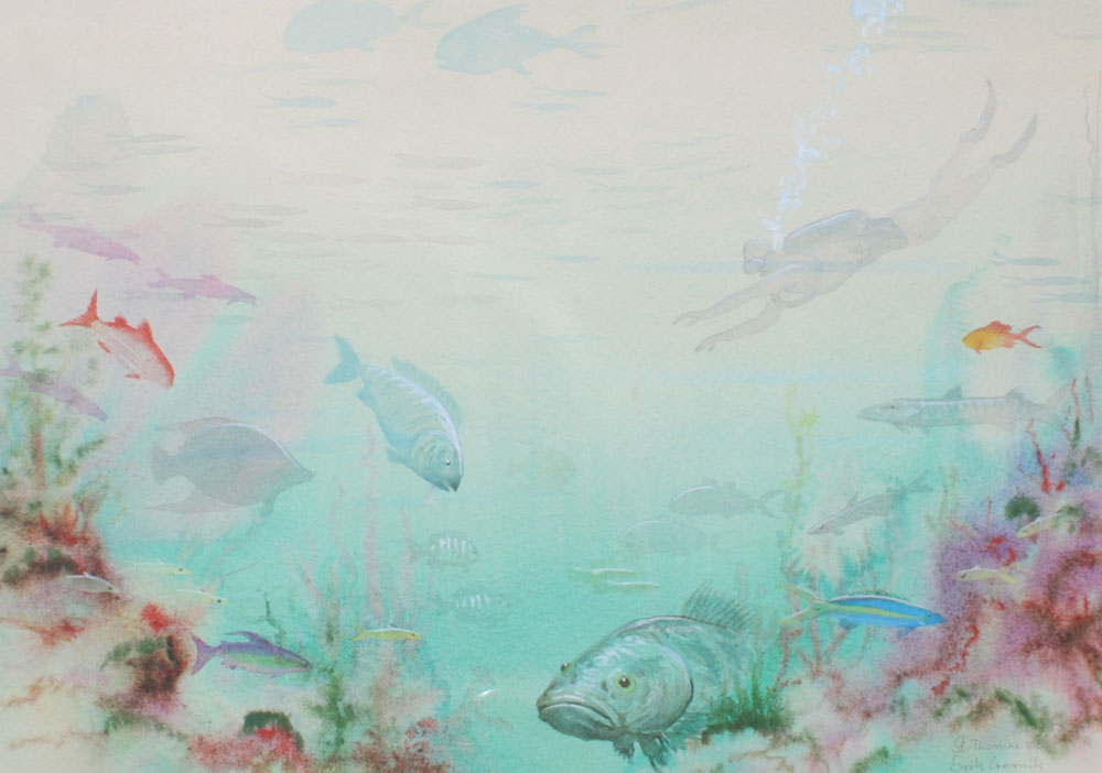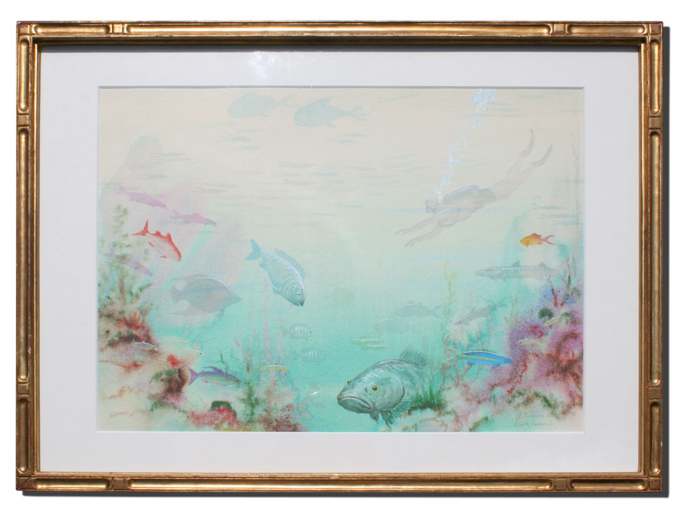 GROMIK, EriK, (American, 20th C): Undersea View with Scuba Diver and Tropical Fish on a Reef, Watercolor, sight size 17'' x 24'', carved and gilded frame, 23 1/2'' x 31 1/2'', signed lower right St. Thomas, Virgin Islands.