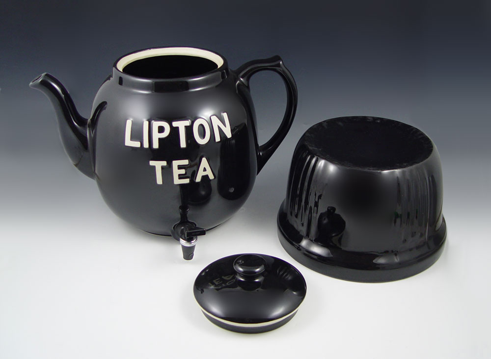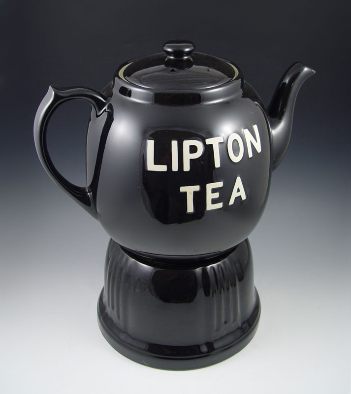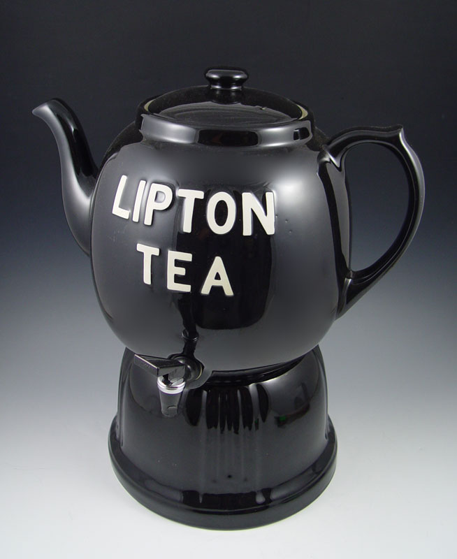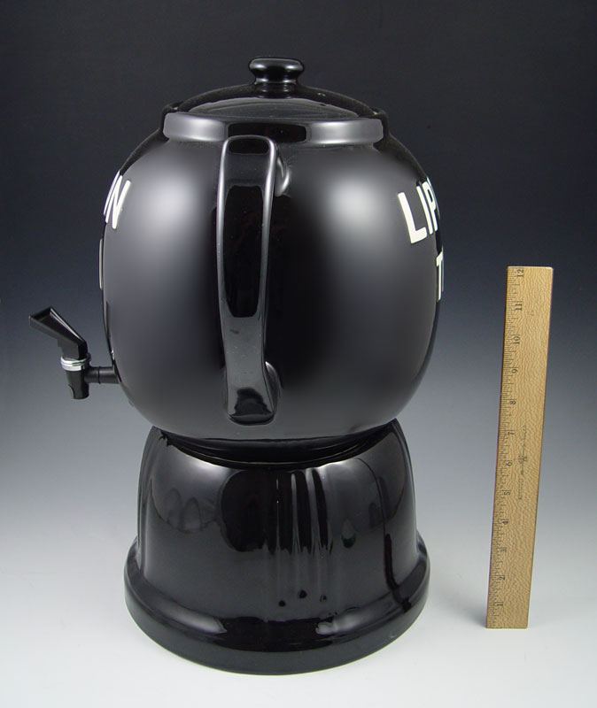 HALL POTTERY LIPTON ICED TEA DISPENSER: Figural dispenser on stand. Hall pottery mark. Approx. 19'' tall