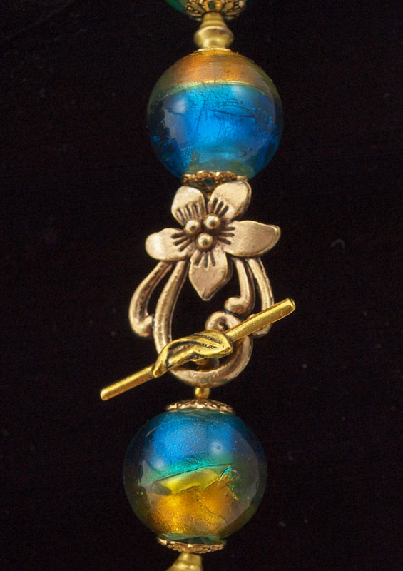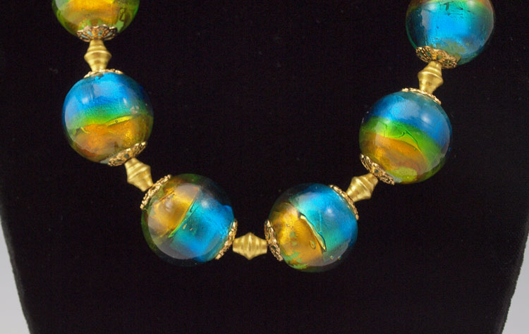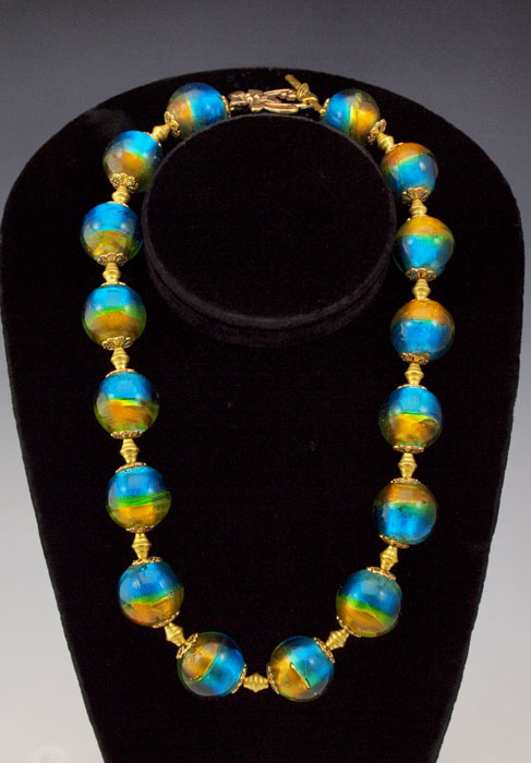 MURANO GLASS BEAD NECKLACE: Murano aventurine glass beads, approx 9.5 mm., toggle clasp. Length, 18''