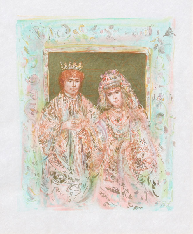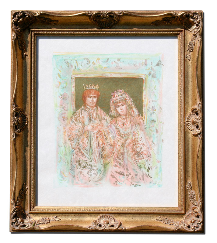 HIBEL, Edna, (American, 1917-): King and Queen, Wedding of David and Bathsheba, Lithograph, sight size 23 1/2'' x 19 1/2'', pencil signed, numbered 170/385, pierced carved and gilded wood frame, 31'' x 26''.