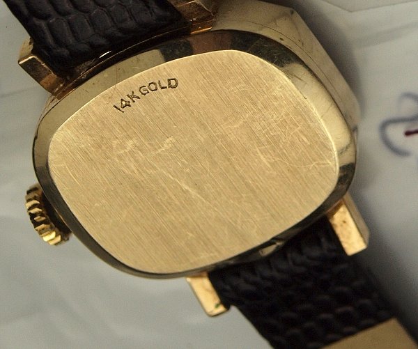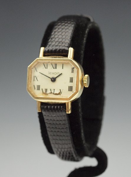 14K GOLD LEXON LADIES WATCH: Solid 14K yellow gold dress watch, 17 jewel Swiss movement, original dial, in running order, new leather band.