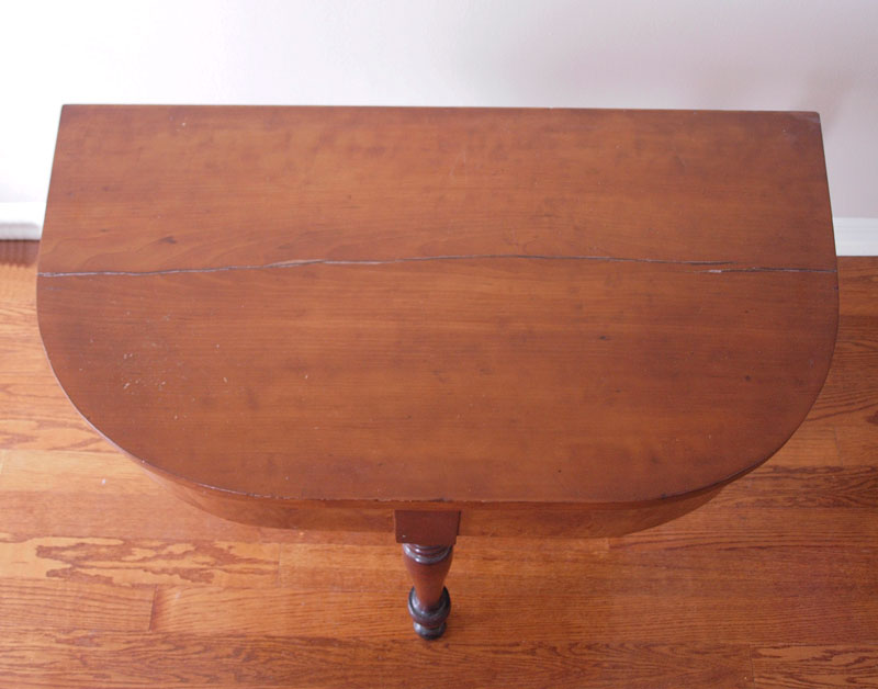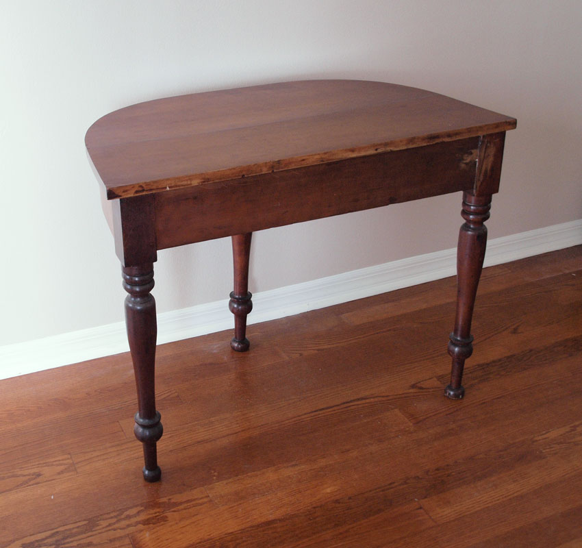19TH CENTURY HALF ROUND SERVER: Three turned legs with ball feet, deep apron with satin veneer, 28 1/2''h. x 36 1/2'' x 19 1/2''.