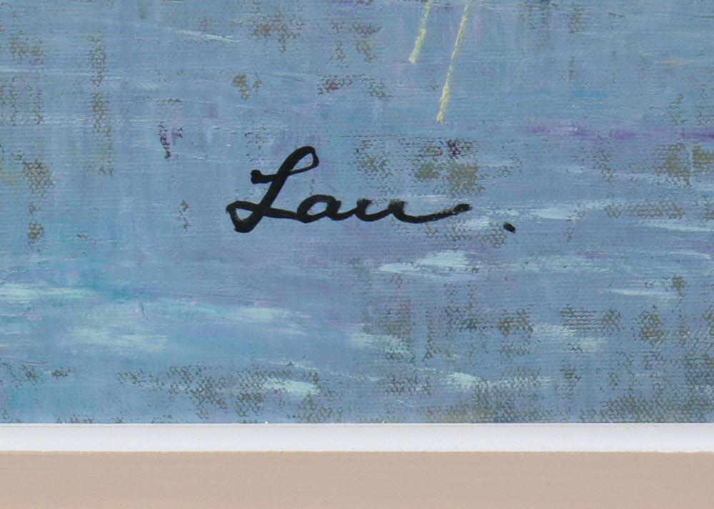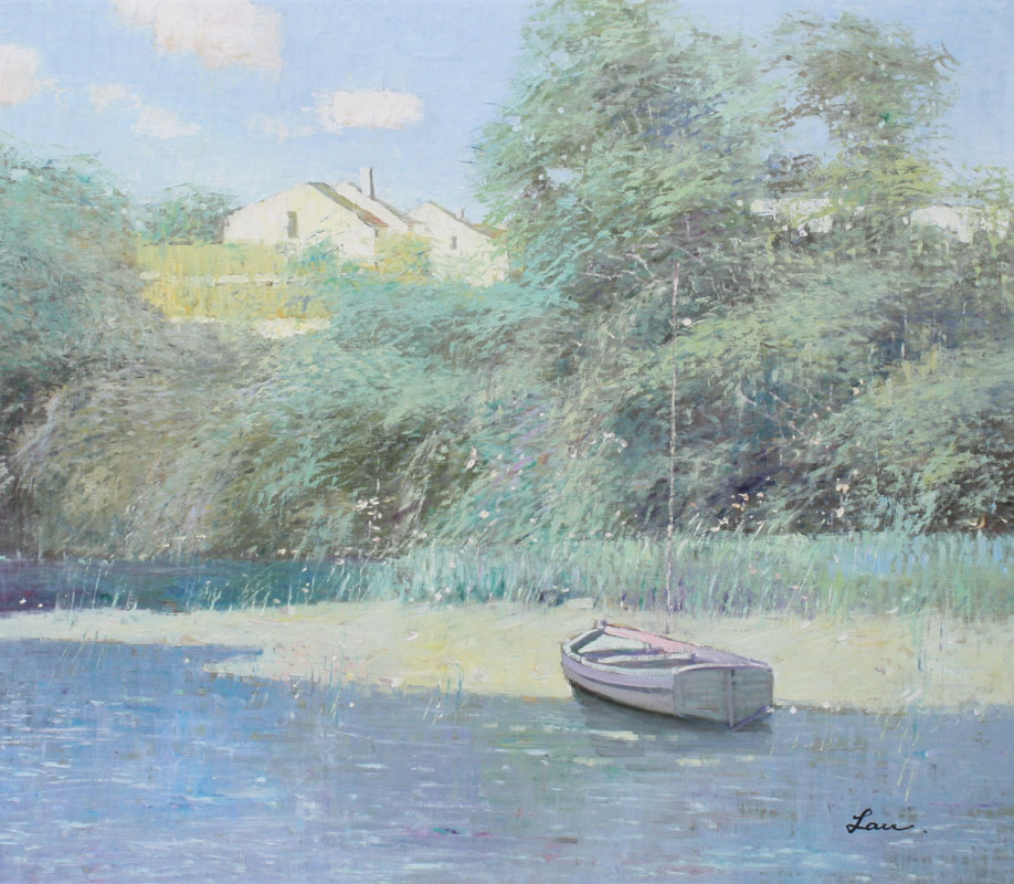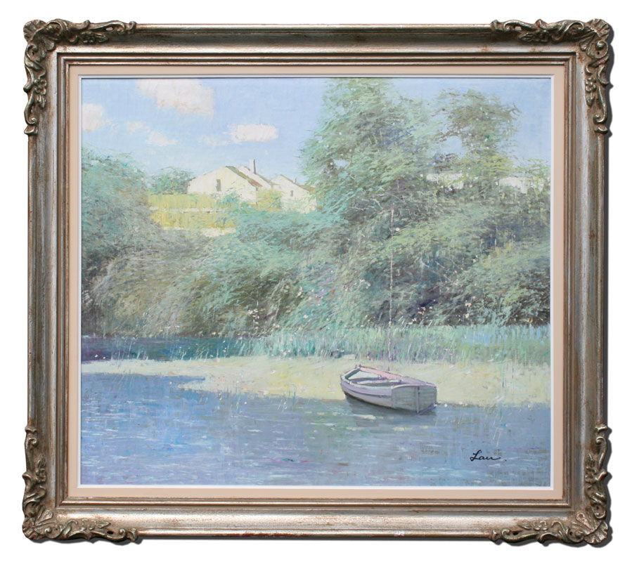 SUN-LIT POND SCENE SIGNED LAU: OIL/Canvas, 27'' x 31'', fine carved and silver gilded frame, 33 1/2'' x 37 1/2''.