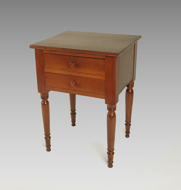 COUNTRY SHERATON 2 DRAWER CHERRY WORK STAND: One over one drawer supported by turned and tapered legs, original wood pulls, 29 1/2''h. x 21 1/2'' x 19 1/2''.