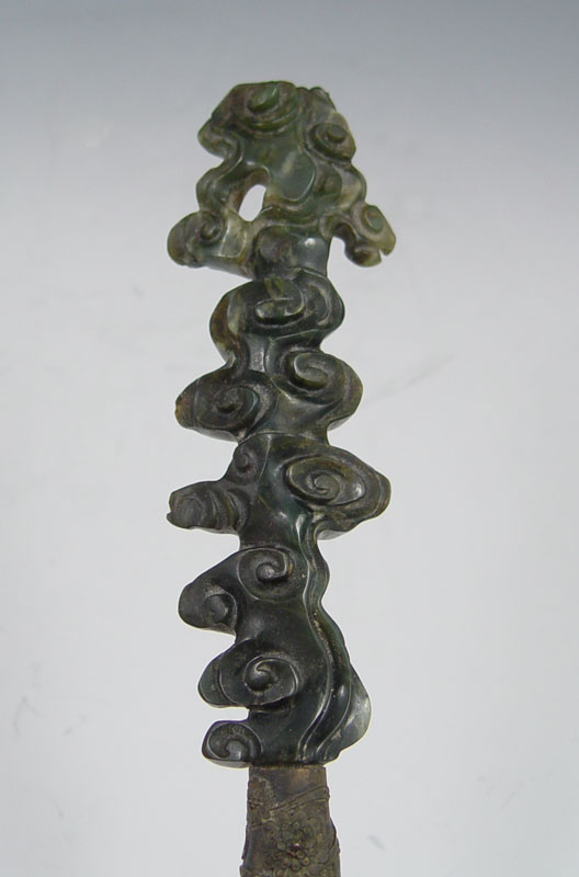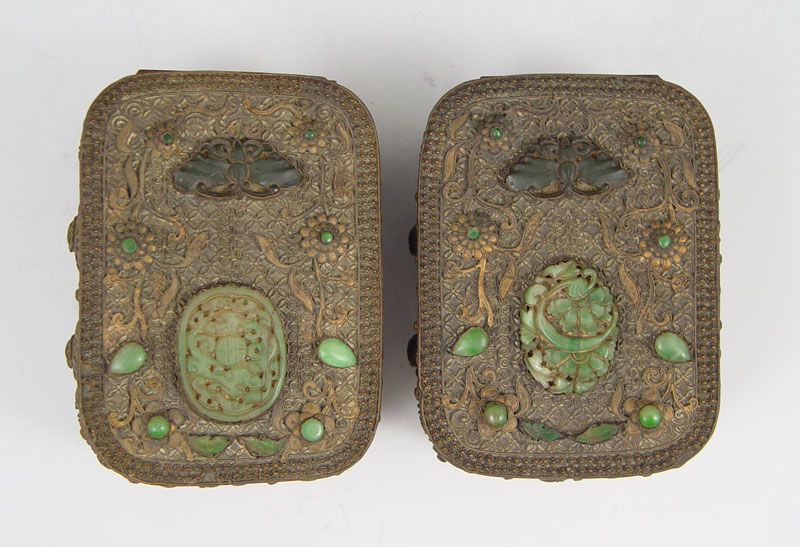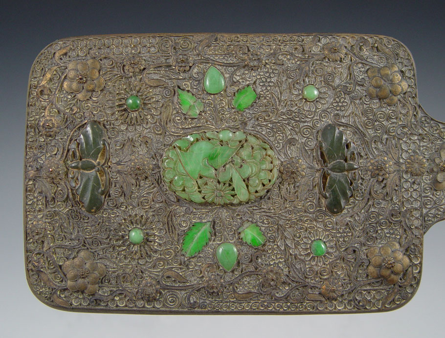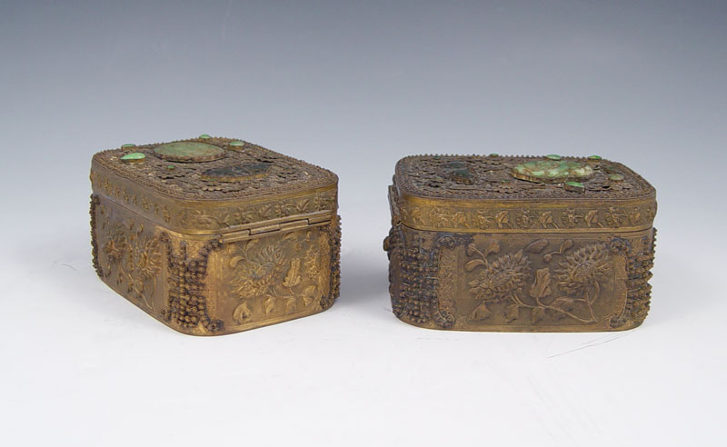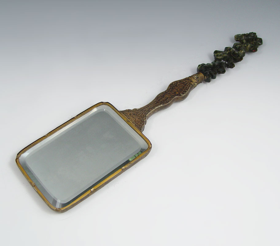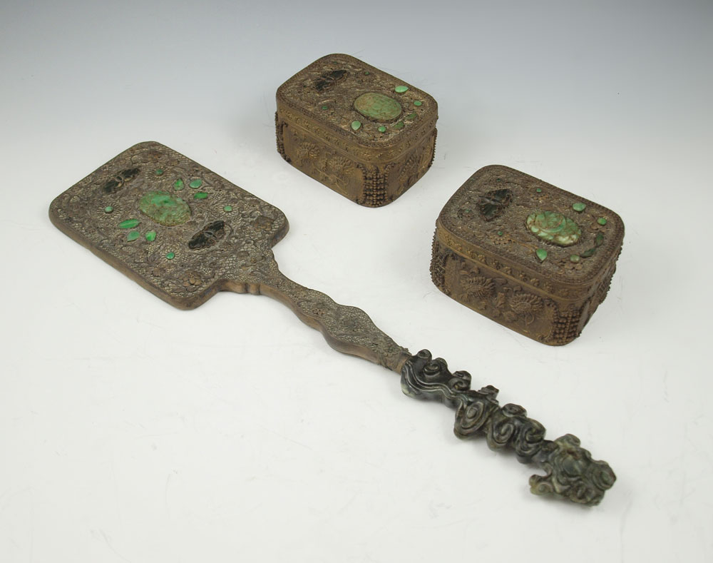 CHINESE STONE INLAID HAND MIRROR AND TRINKET BOXES: 1) Stone inlay hand mirror with carved stone handle, 17.5''l. 2) A pair of brass stone inlay covered boxes, 2.25''h. x 4.25'' x 3.25.
