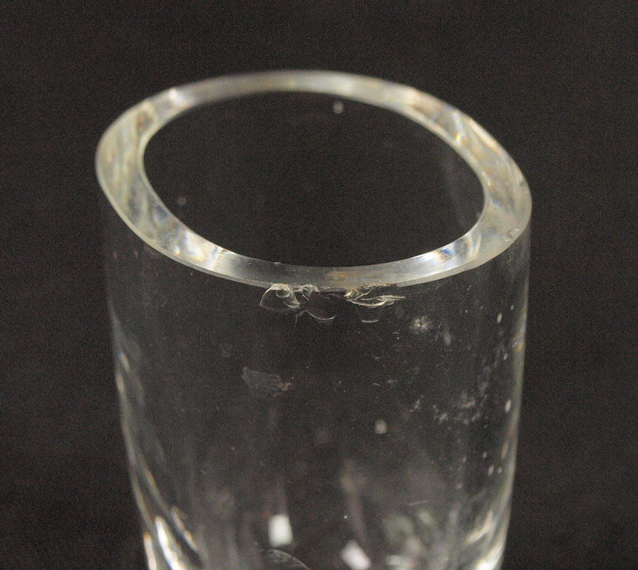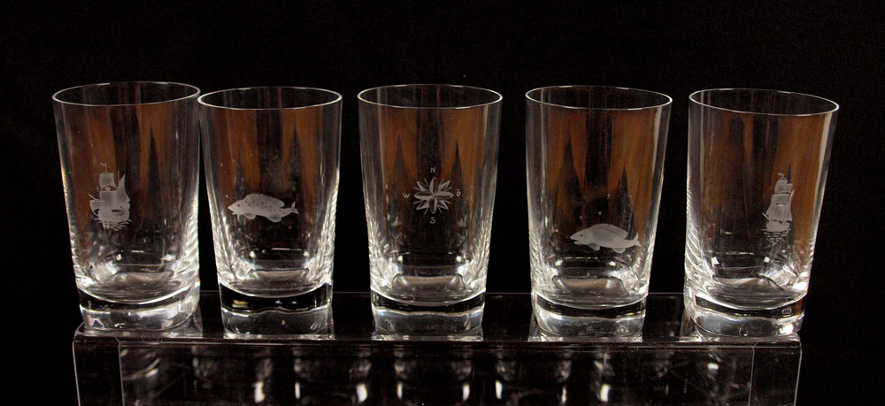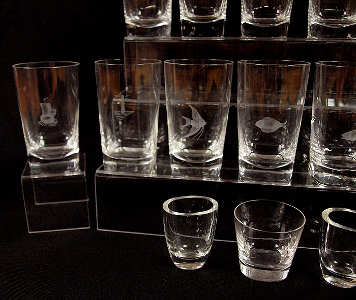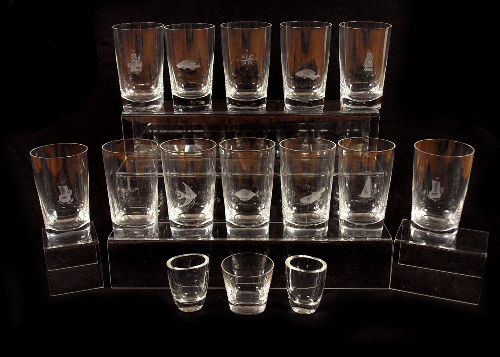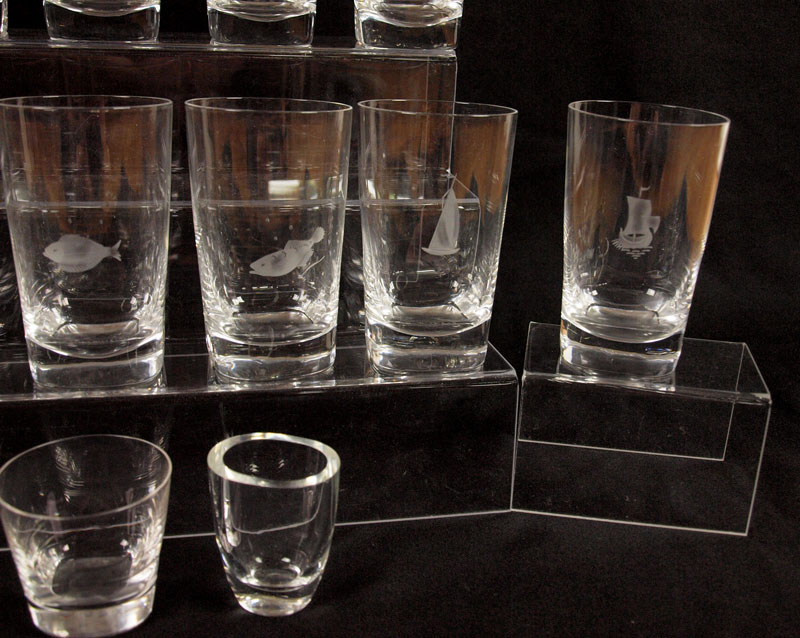 ORREFORS CRYSTAL TUMBLERS: 25 pieces to include 12 tumblers (5 1/8''), 11 juice tumblers(2 1/2'') and 2 toothpick holders. The tall tumblers are each etched.
