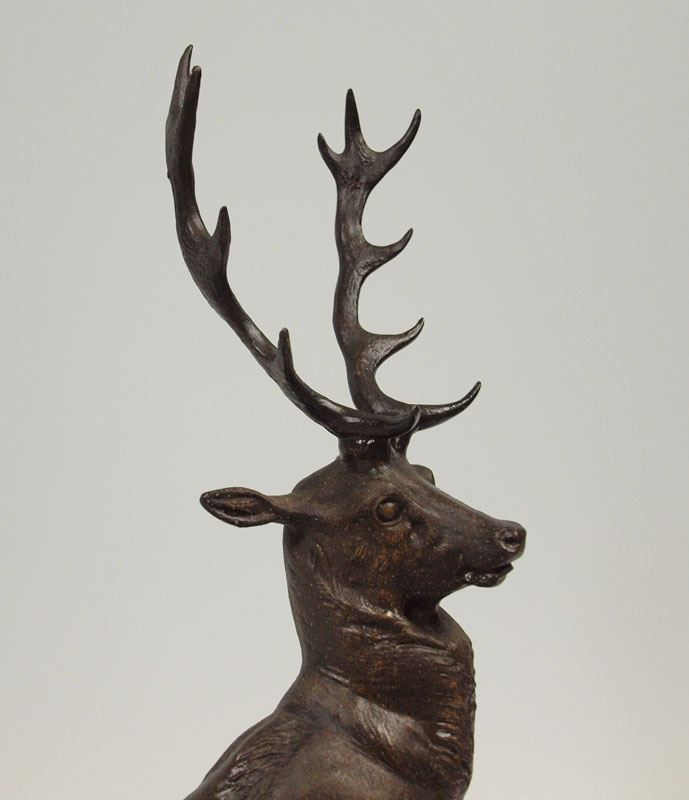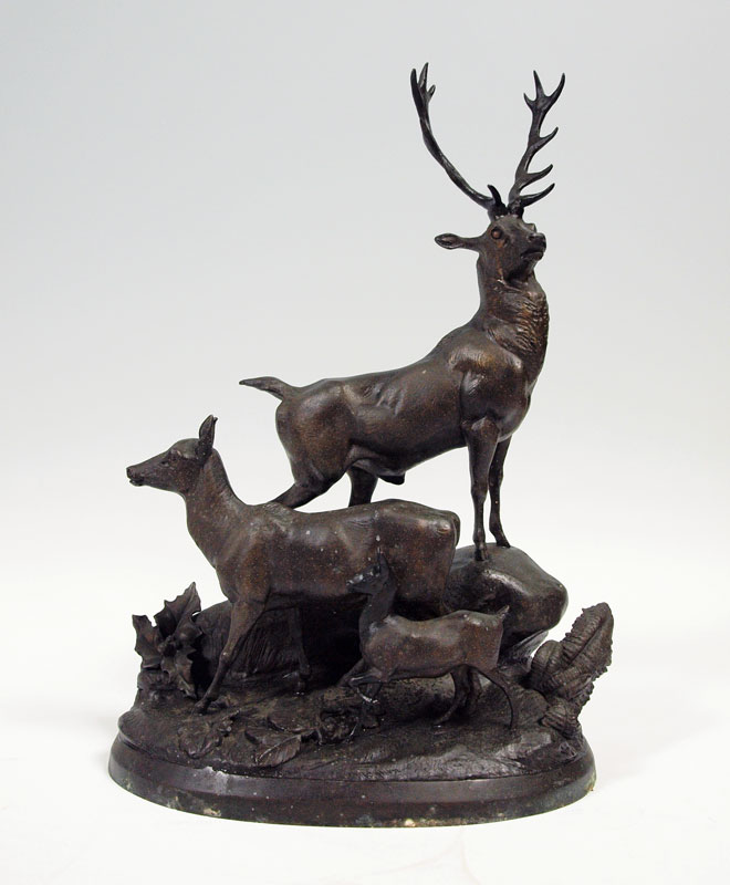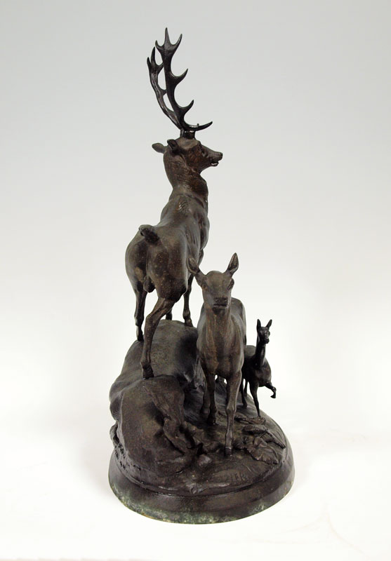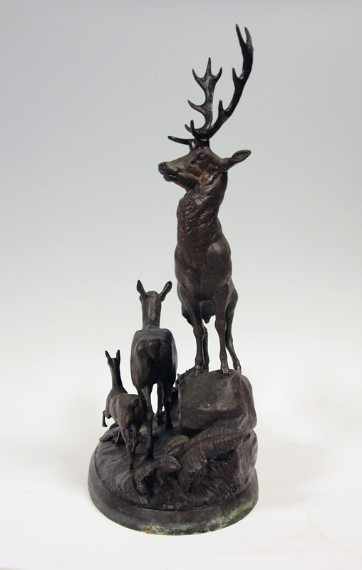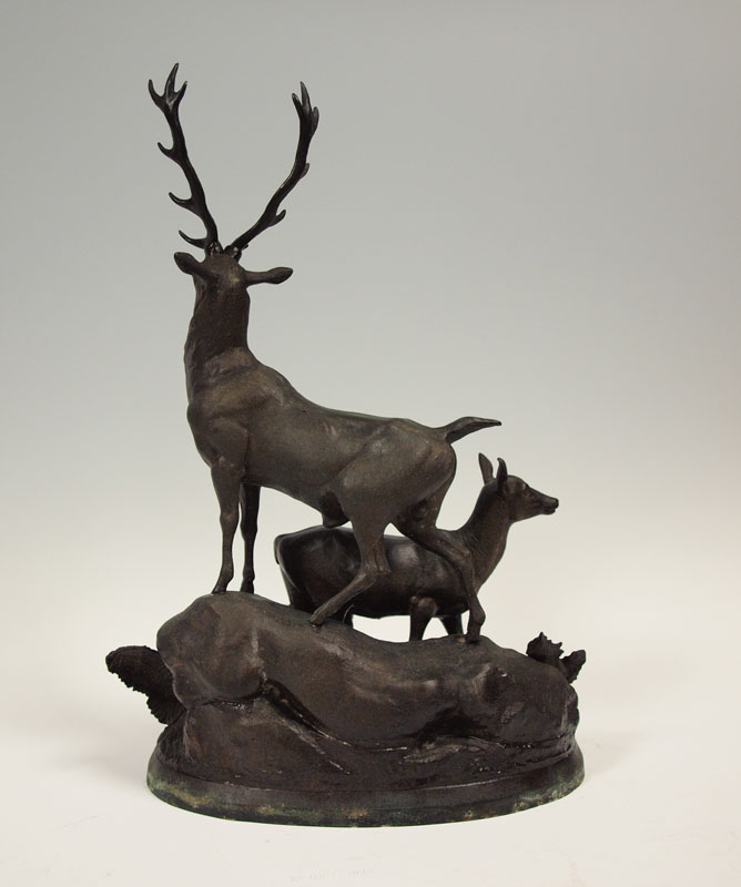 HEIZLER, Hippolyte, (European, 1828 - 1871): Stag grouping, Patinated Metal, 22 1/2''h, signed in the base. Condition - Pitting and overall wear to finish.