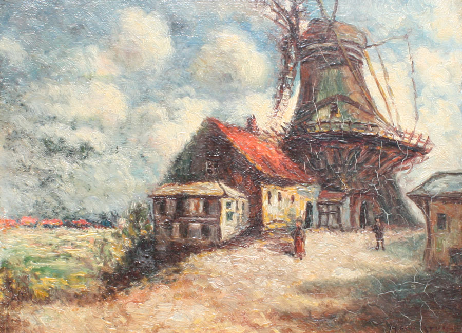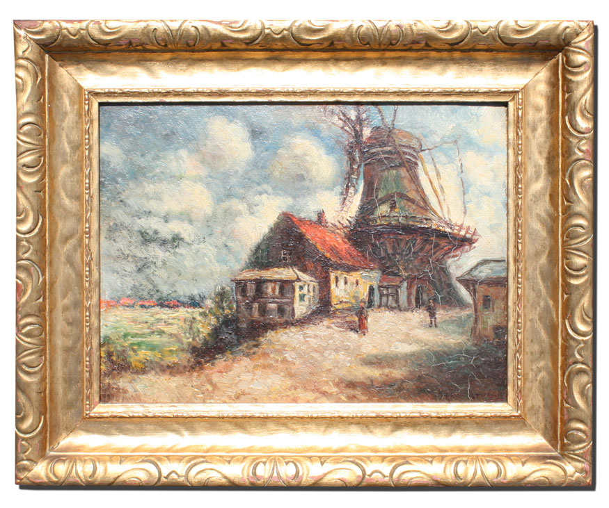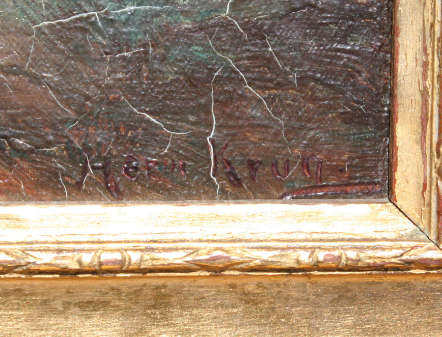 LANDSCAPE WITH WINDMILL AND FIGURES SIGNED HERM. KRUG: OIL/Board, circa 1900, 9 1/4'' x 12 3/4'', encased in Newcomb-Macklin carved and gilded picture frame with wear, 14'' x 17''.
