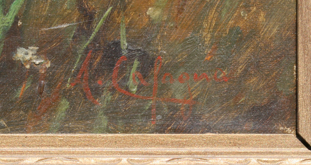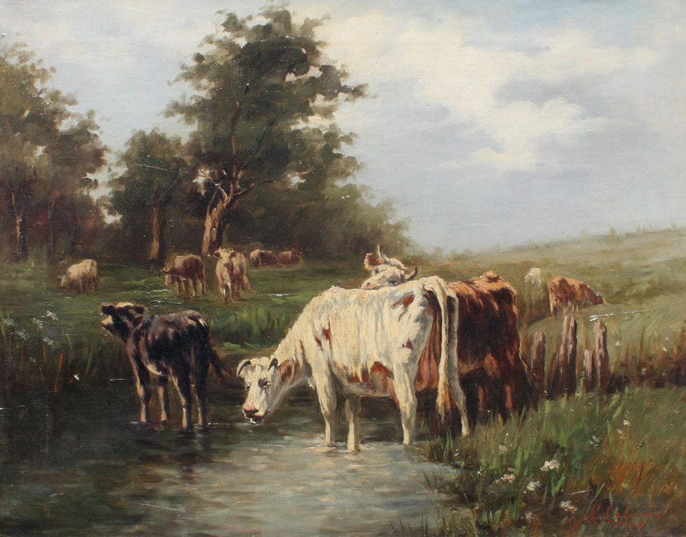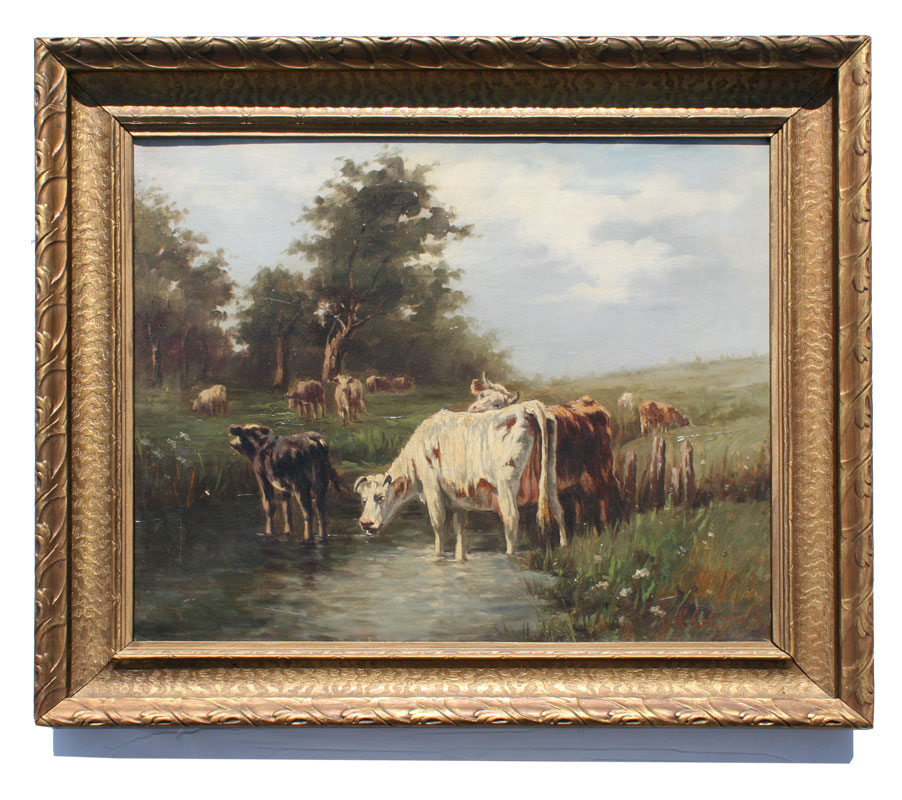 TURN OF THE CENTURY LANDSCAPE WITH COWS WATERING SIGNED M. CALAGNA: OIL/Canvas, 18'' x 22'', encased in a carved and painted gold frame with wear, 24'' x 27 1/2''.