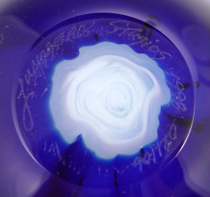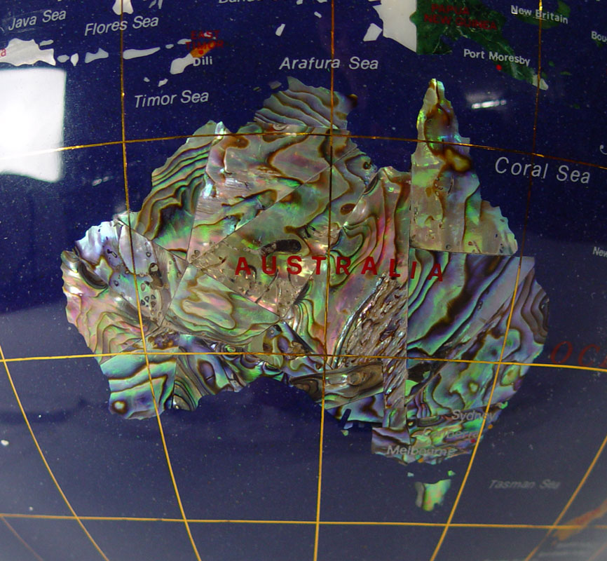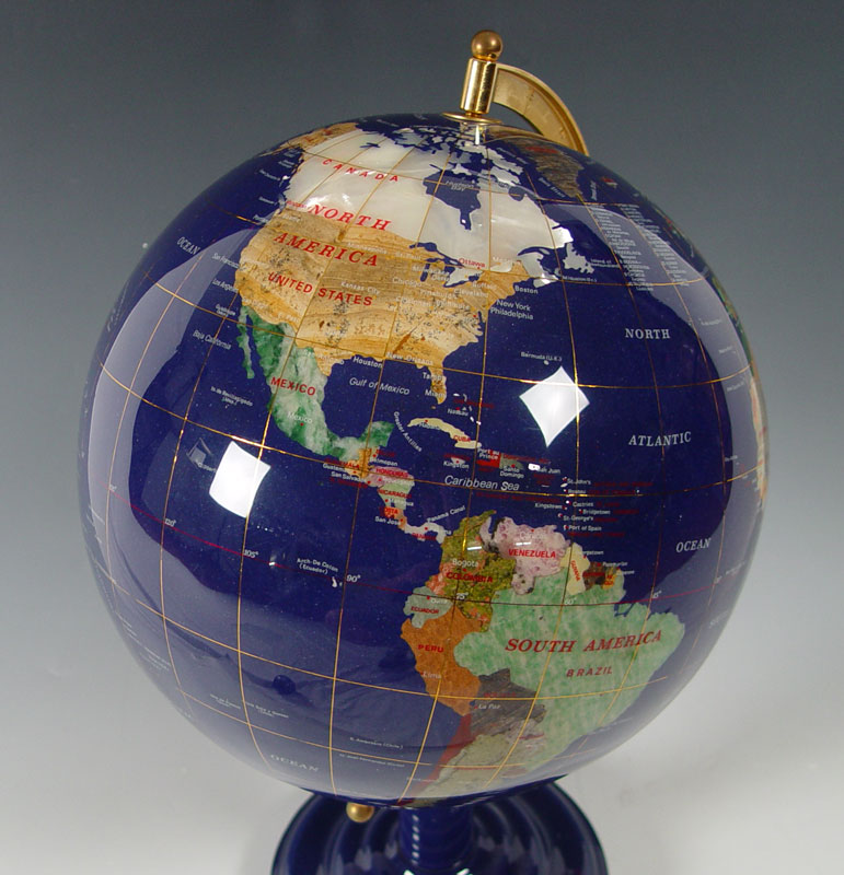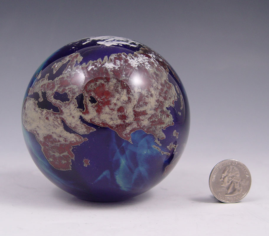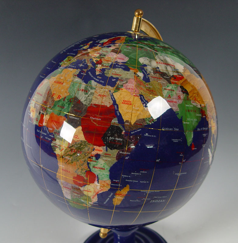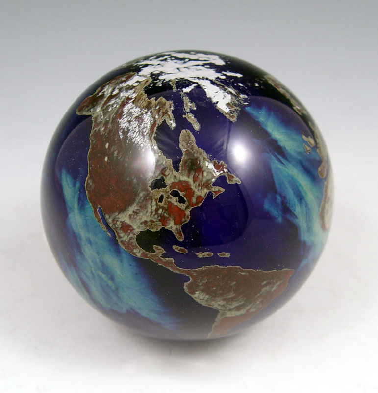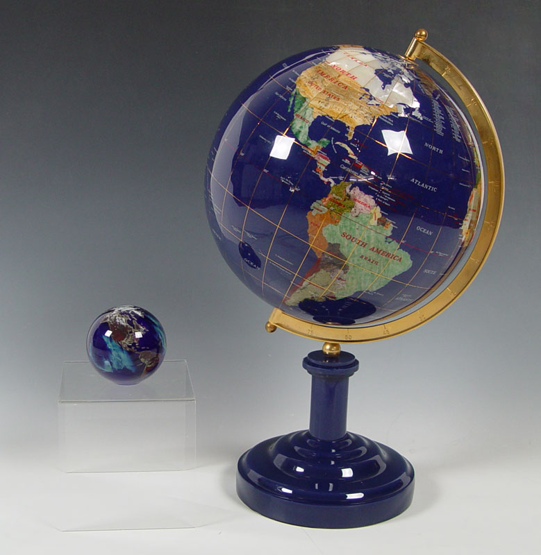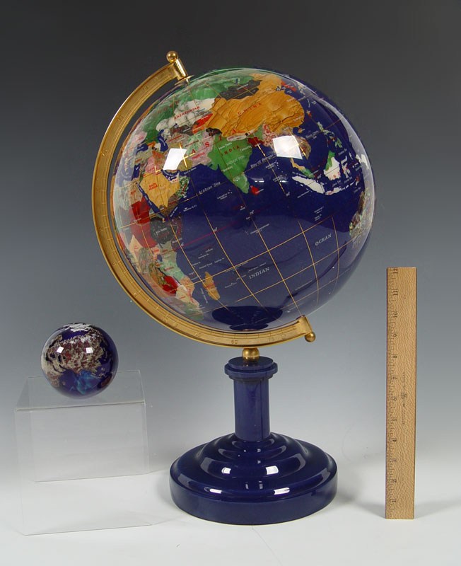 SEMI PRECIOUS STONE INLAY GLOBE AND GLOBE GLASS PAPERWEIGHT: To include 1) Modern globe as the Russian states have been separated, constructed of semi precious inlaid stones. 22'' h. x 13''. 2) Glass globe paperweight signed Stuzios 1998, 3 1/2'' dia.