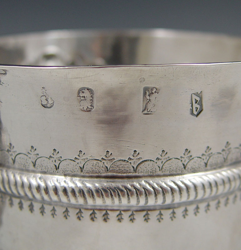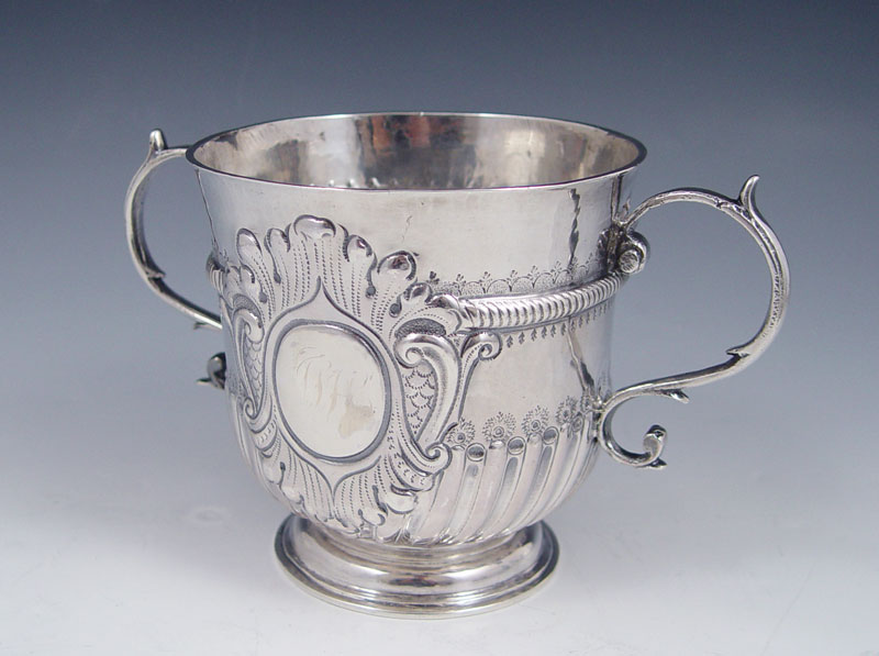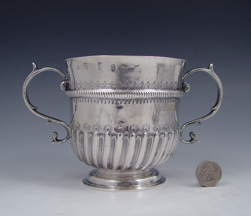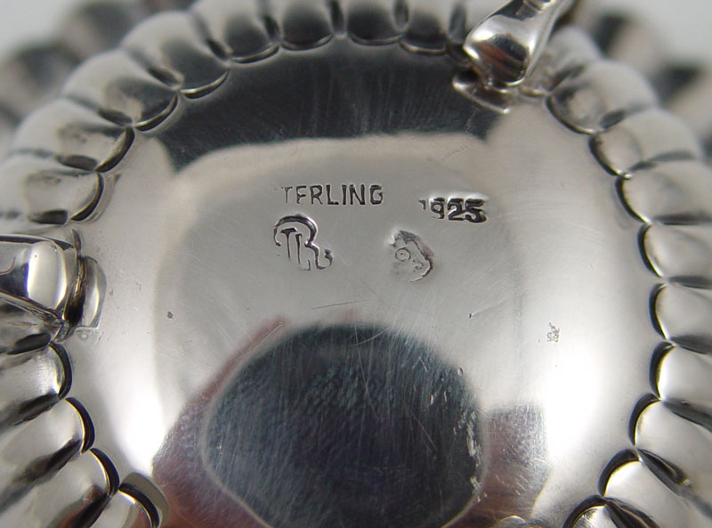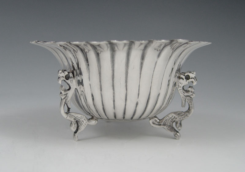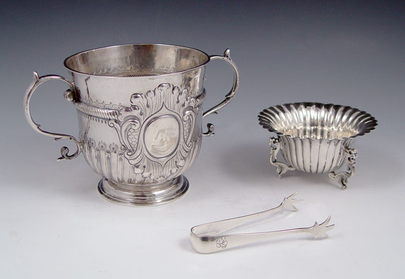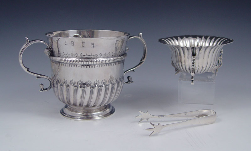 WORLDLY ESTATE 3 PIECE SILVER COLLECTION: To include 1) Handled cache pot from unidentified Hanau maker. Embossed and engraved designs with applied handles. 800 silver. 4 1/2'' h. x 7 3/4''. 2) Juventino Lopez Reyes Mexican sterling footed small bowl with ribbed sides and applied figural feet. 2 1/4'' h. x 3/8''. 3) American Gorham sterling sugar tongs. 4 1/2'' long. Approx. 15.9 troy oz.