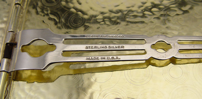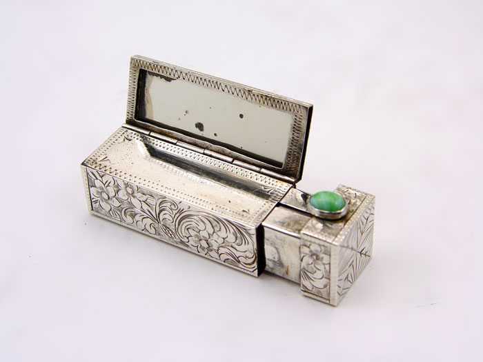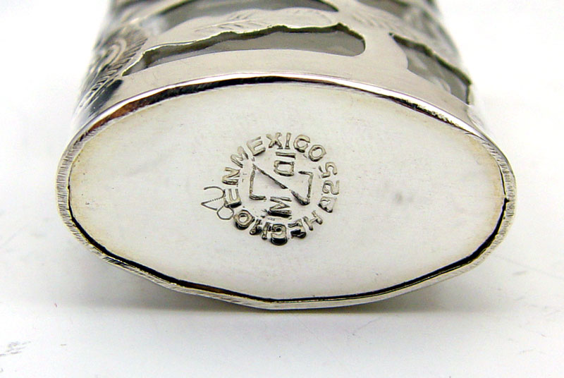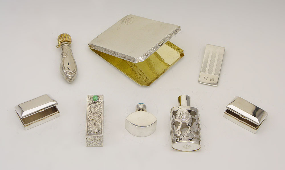 ESTATE STERLING & 900 SILVER VANITY ITEMS: 8 pieces to include 1) Elgin American Co. hammered design card case, monogrammed. 2) 800 silver engraved lipstick case with mirror. 3) Pair 900 silver pill boxes, engraved with name. 4) Tiffany & Co. money clip, monogrammed R. B.. 5) Mexican silver perfume with blue stone. 6) Unknown maker Mexican silver overlay perfume. Approx. 6.7 troy oz. Also sold with silverplate perfume.