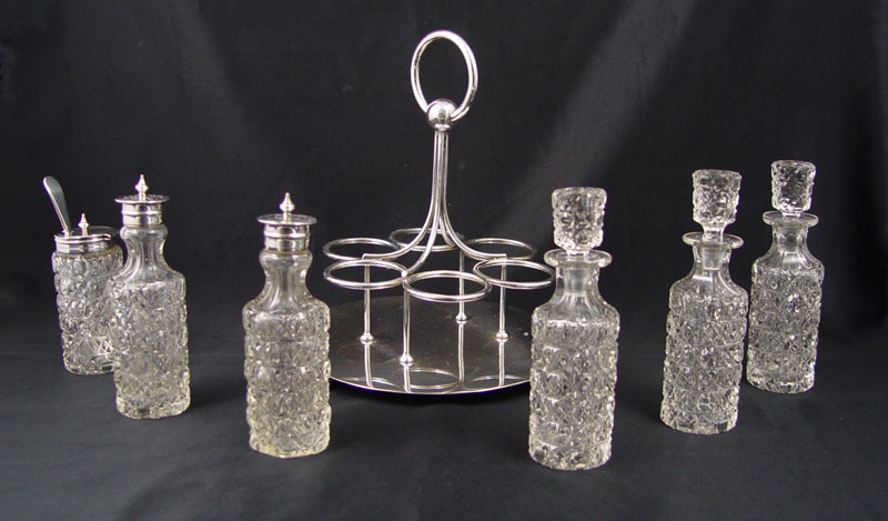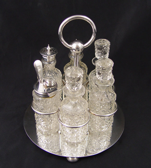 CRUET STAND WITH CUT GLASS BOTTLES: HWL silverplated stand, 6 condiment bottles. 9'' tall.
