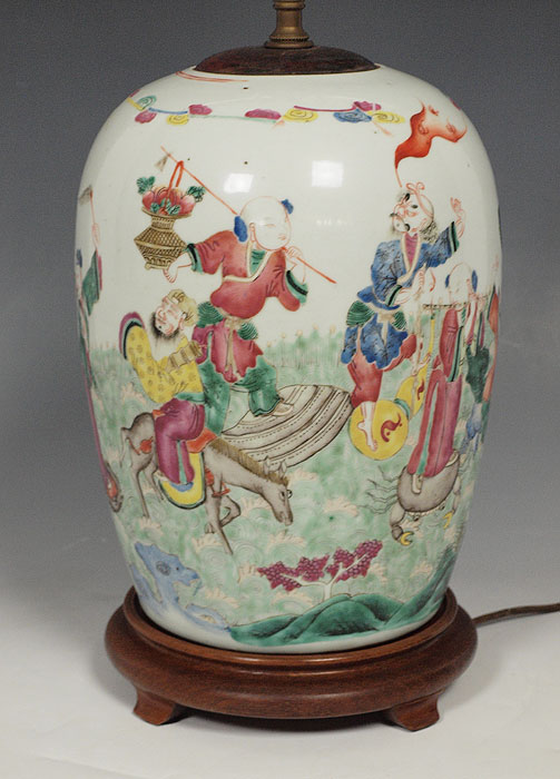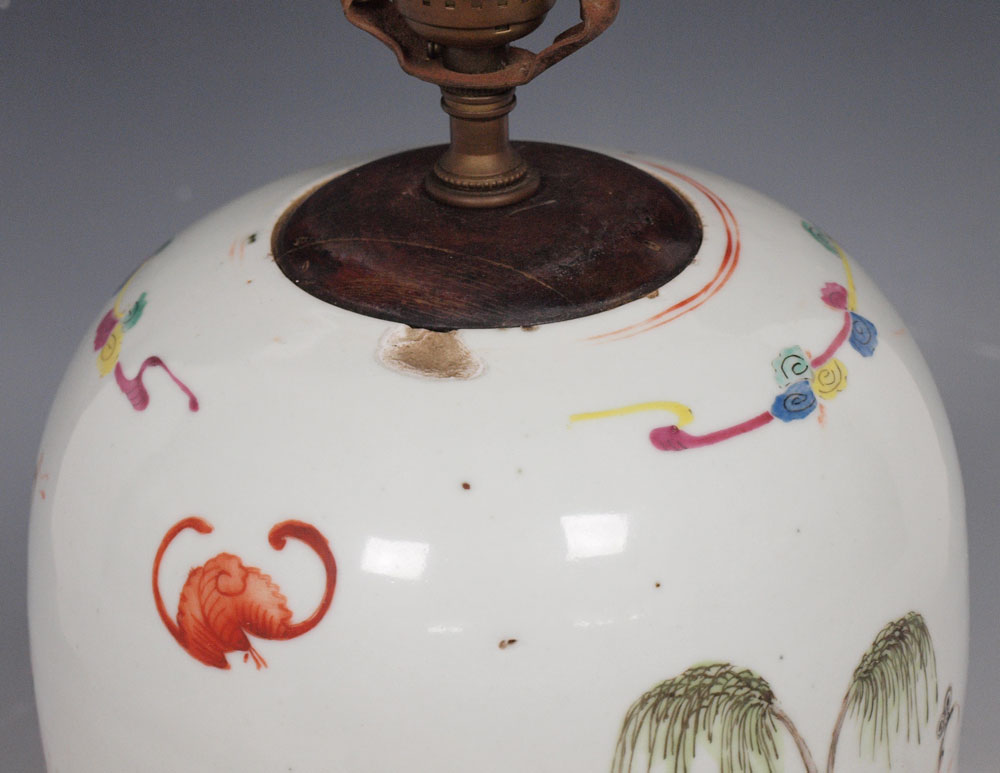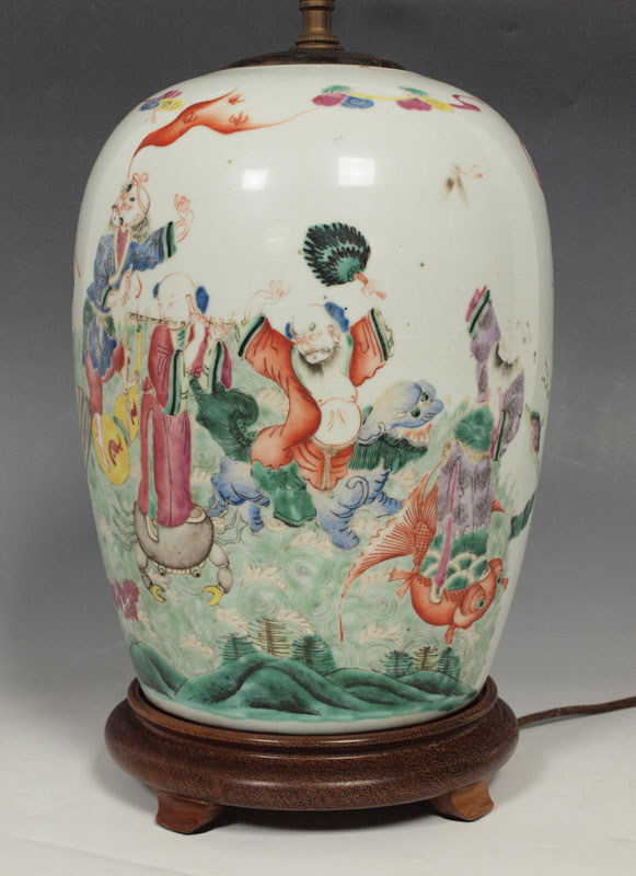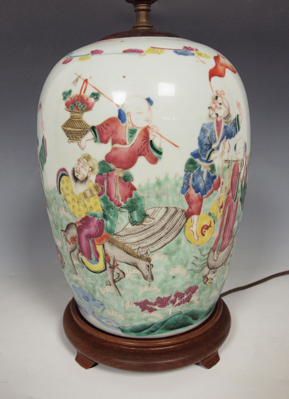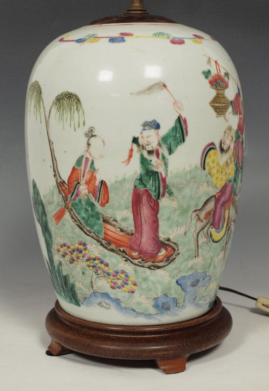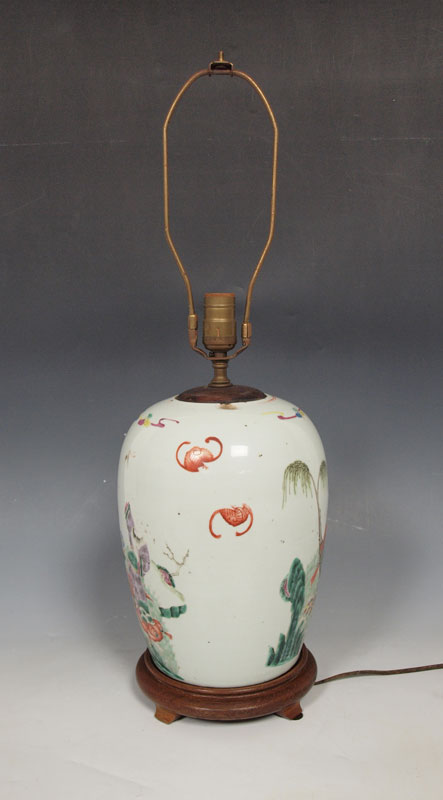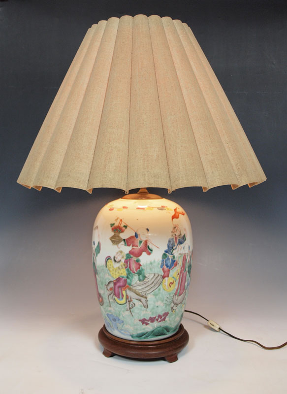 CHINESE HAND PAINTED JAR: Mounted as a lamp. The jar is 11'' tall, the lamp 27'' overall.