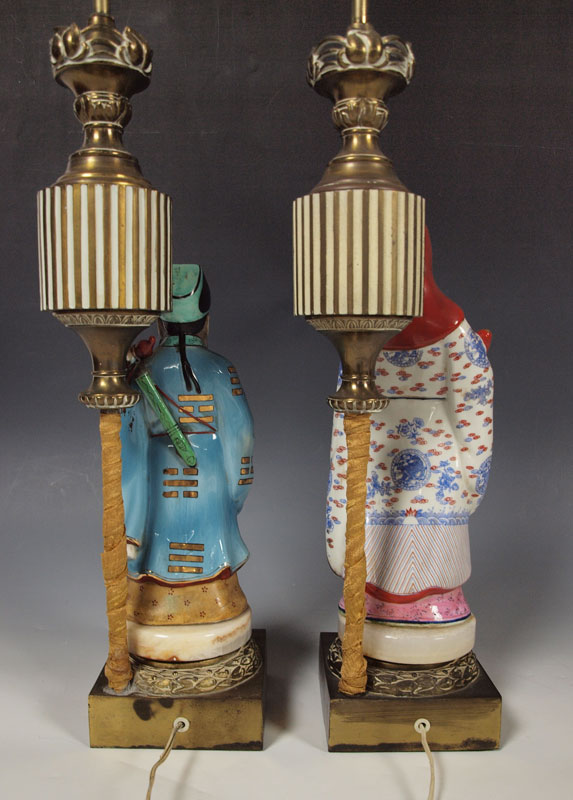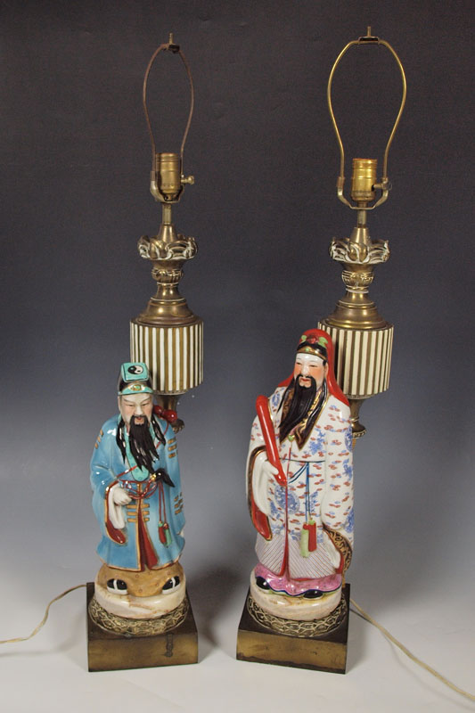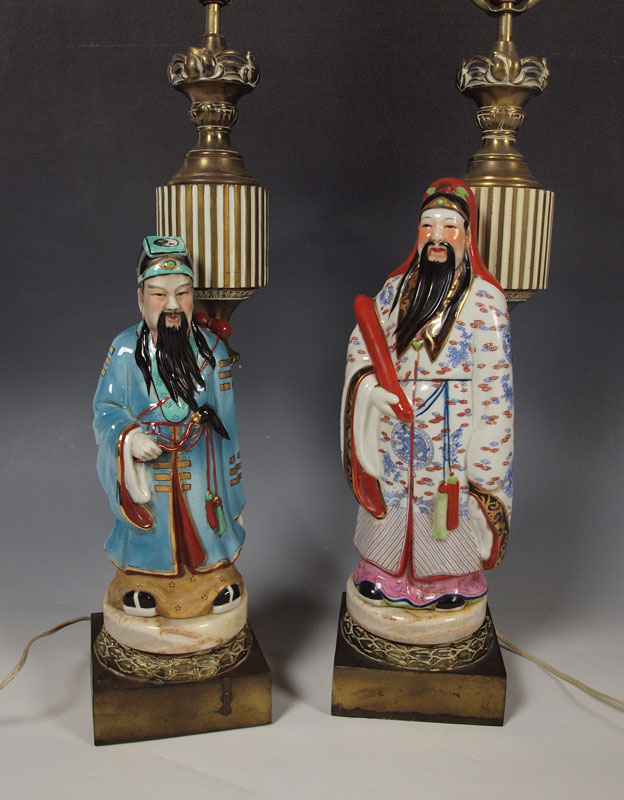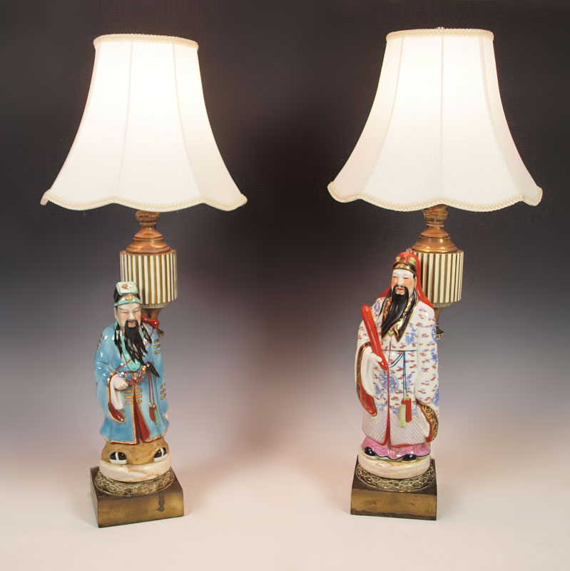 2 CHINESE POLYCHROME FIGURAL LAMPS: Two figures representing the star gods. Mounted as lamps. Figures are 12 and 15'' tall, lamps measure 32'' overall.