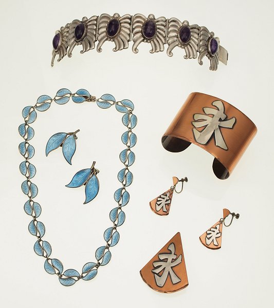ESTATE JEWELRY: To include David Anderson 16'' enameled sterling necklace with earrings. Copper cuff bracelet with pin and earrings and a Mexican sterling 1 3/8'' wide link bracelet set with amethysts, 6 1/2''l. .
