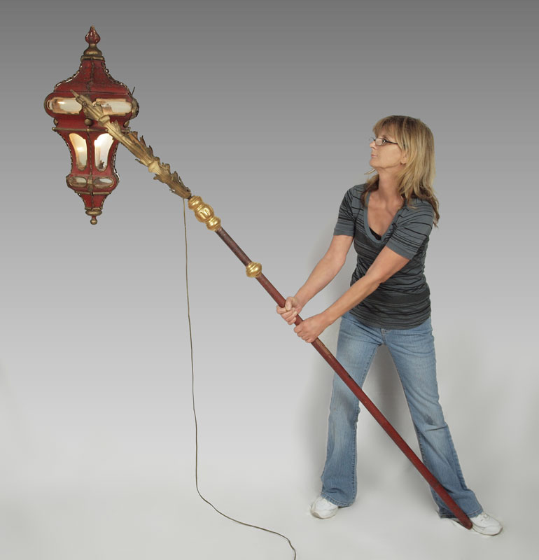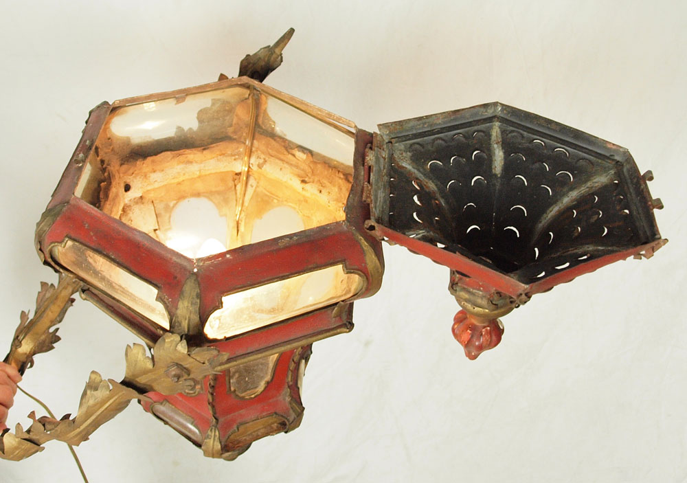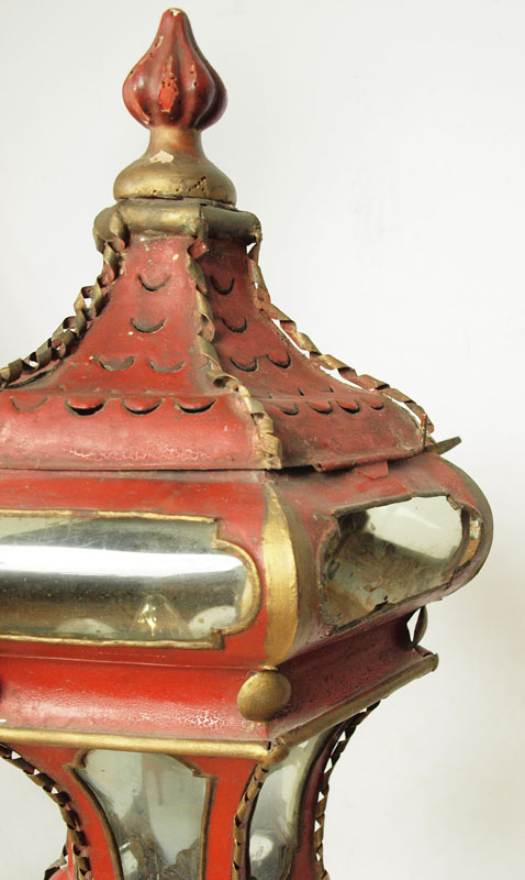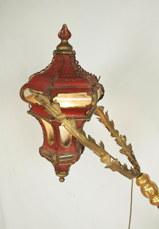 19th C VENETIAN GONDOLA LANTERN: Gilt metal lantern attached to gilt and painted wood pole. Electrified. Approx. 90''l overall.