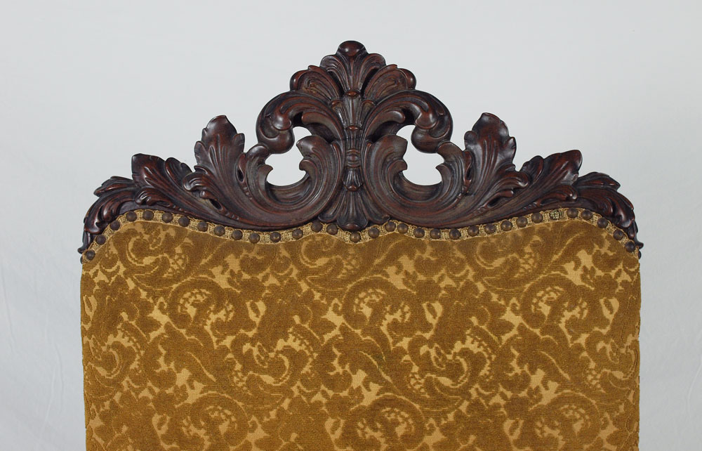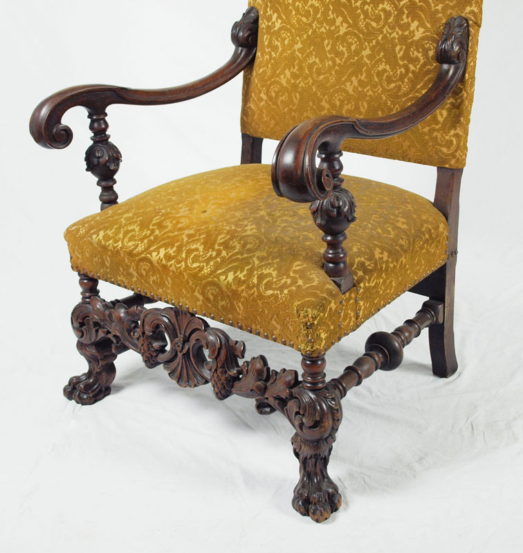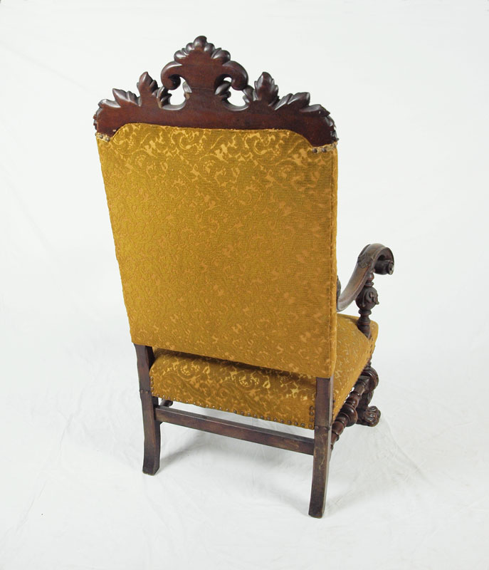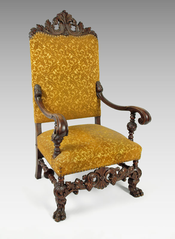 RICHLY CARVED MAHOGANY THRONE CHAIR: Carved crest, rolled arm, carved and open cut base with paw feet, turned stretcher, back and seat upholstered in old gold brocade and studded fabric, 52''h. x 30'' x 31''.