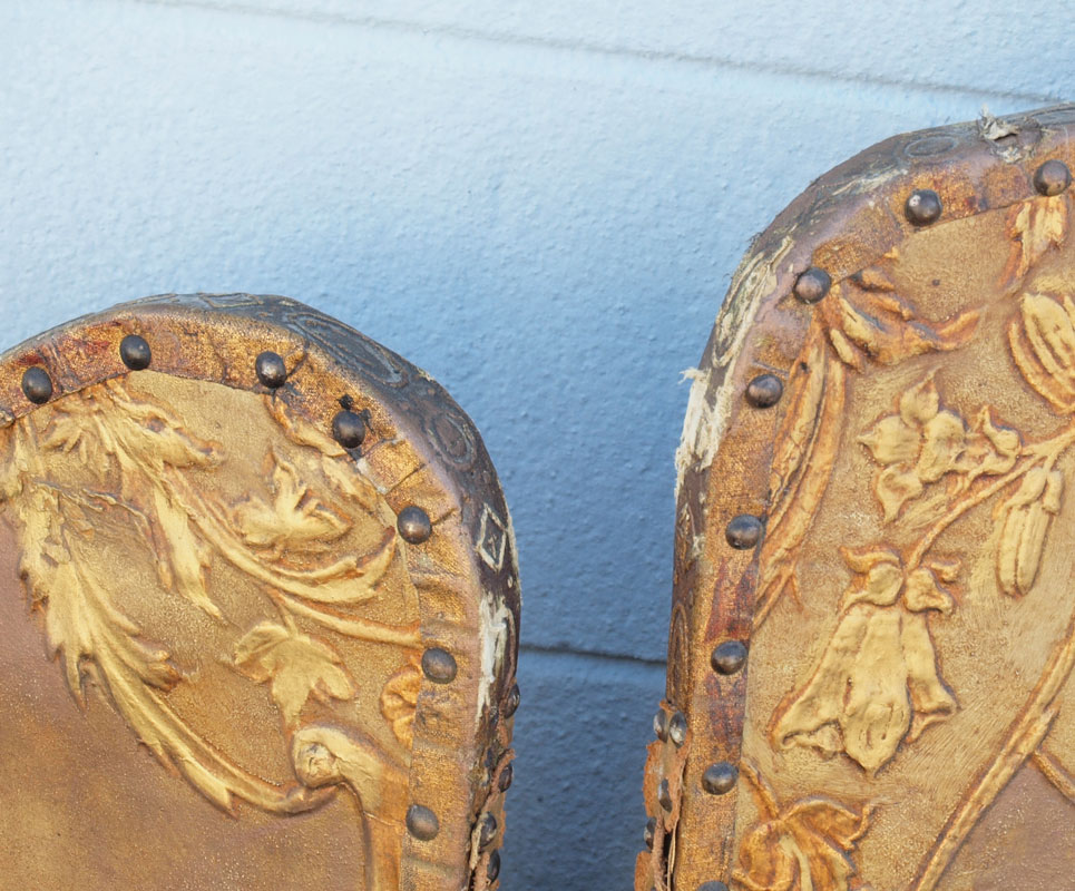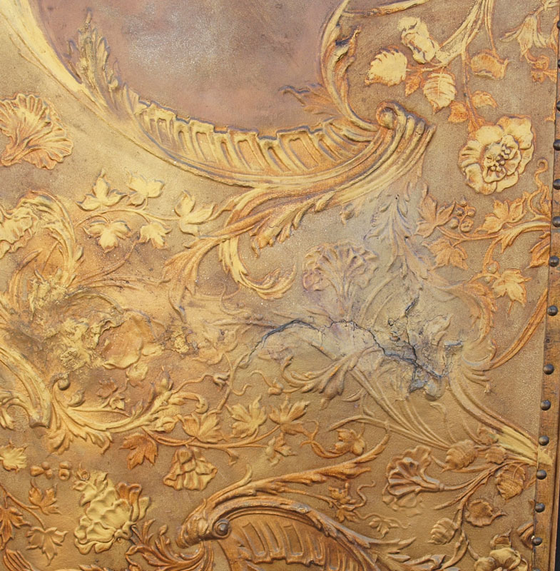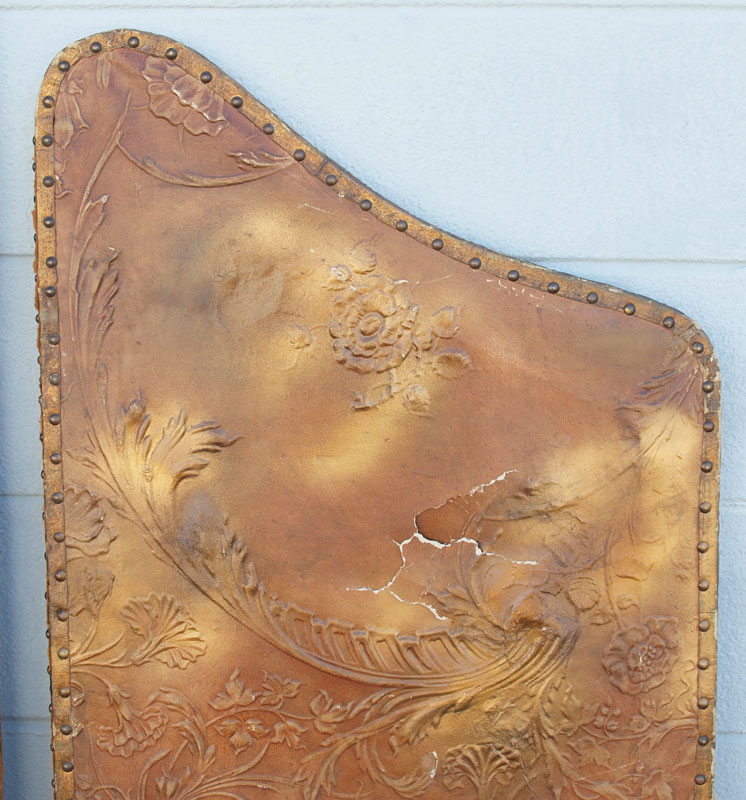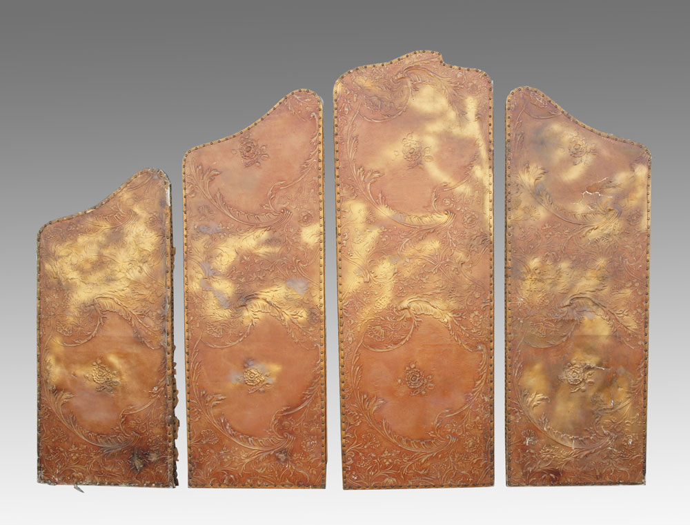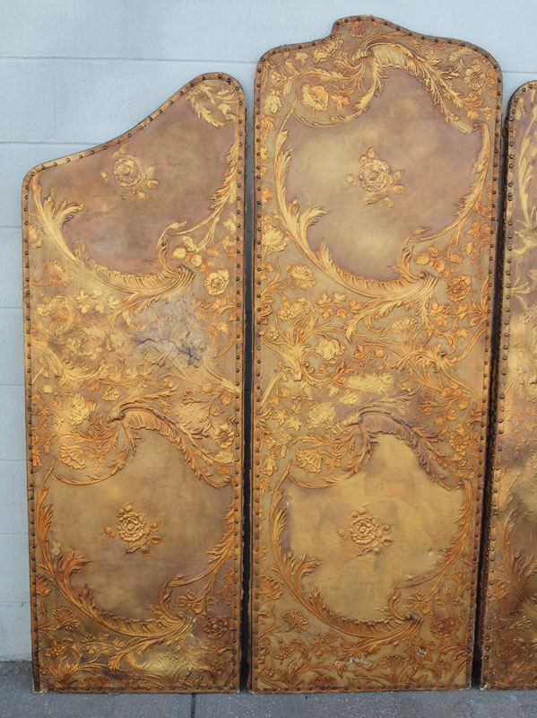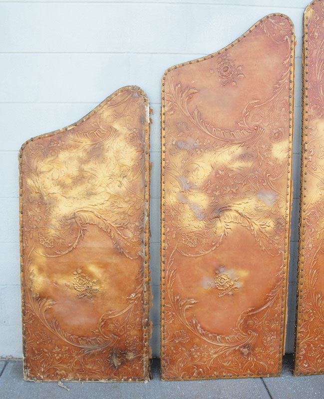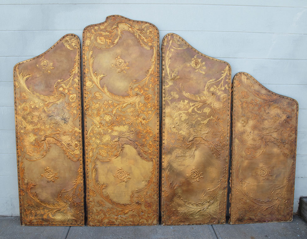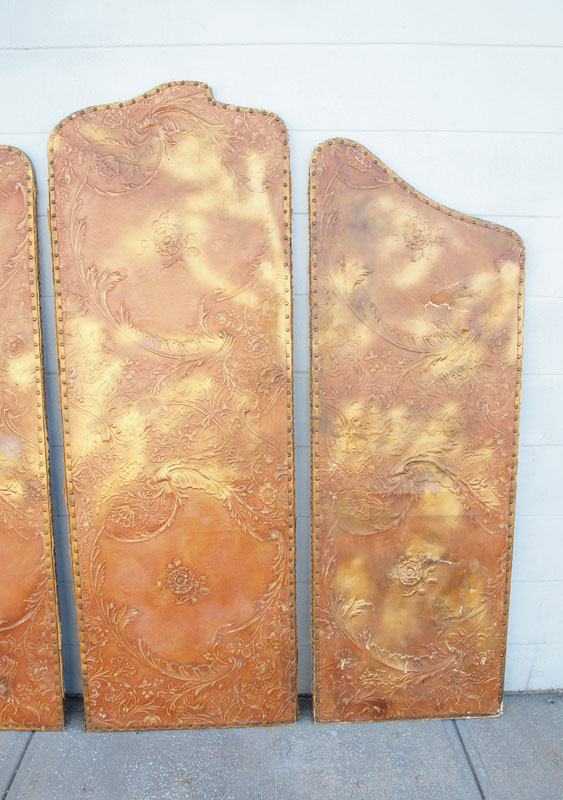 FOUR EMBOSSED CARDBOARD AND CANVAS PANELS: Floral design to panels, geometric embossed canvas trim with brass studs, 51 3/4''h. x 22'', two 63 1/2''h. x 22'' and 69''h. x 24''w.