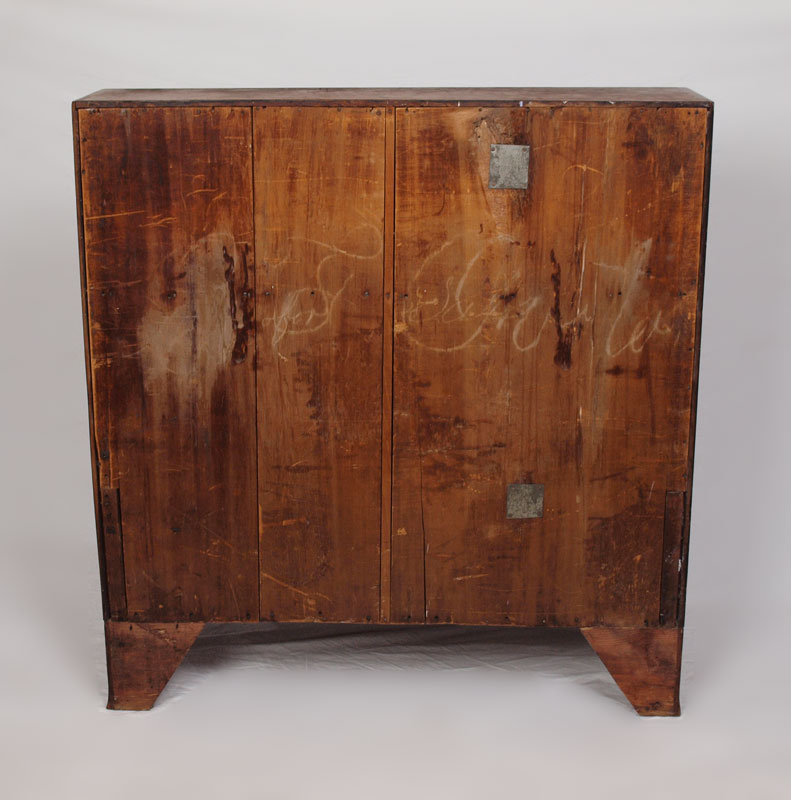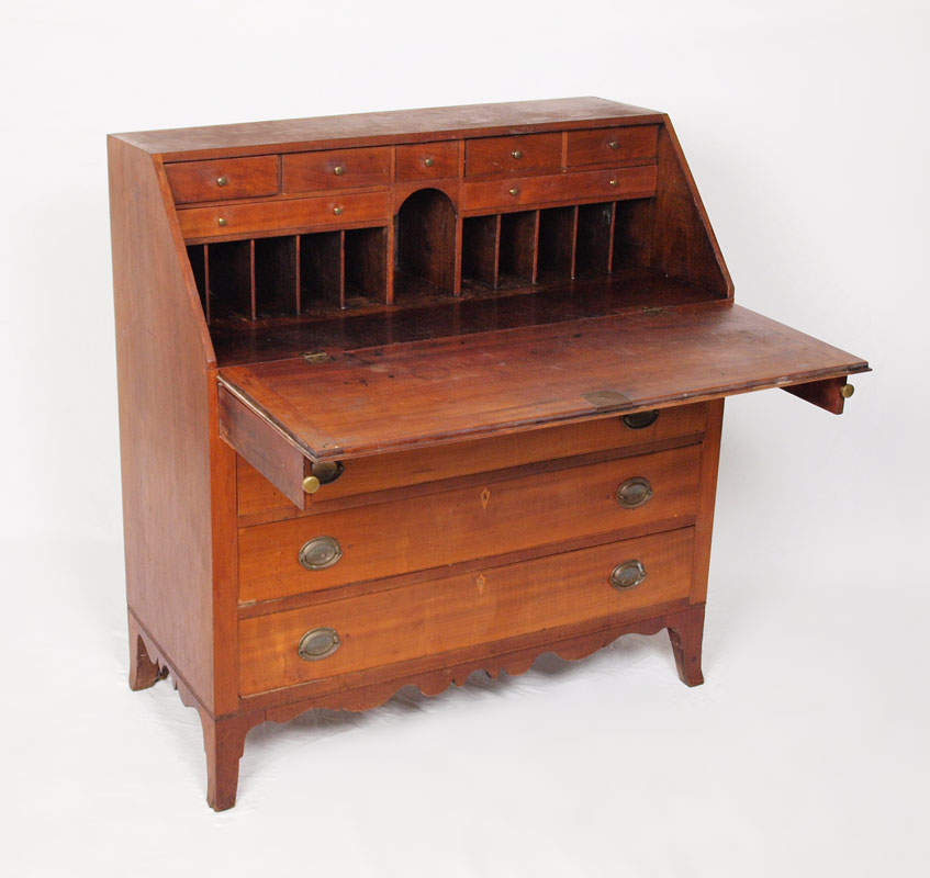HEPPLEWHITE CHERRY SLANT FRONT DESK: Slant front with fitted interior, support slides, 4 graduated drawers, inlaid escutcheons to faux lock holes, with cut apron and French feet, 43''h. x 40 1/2'' x 19''.