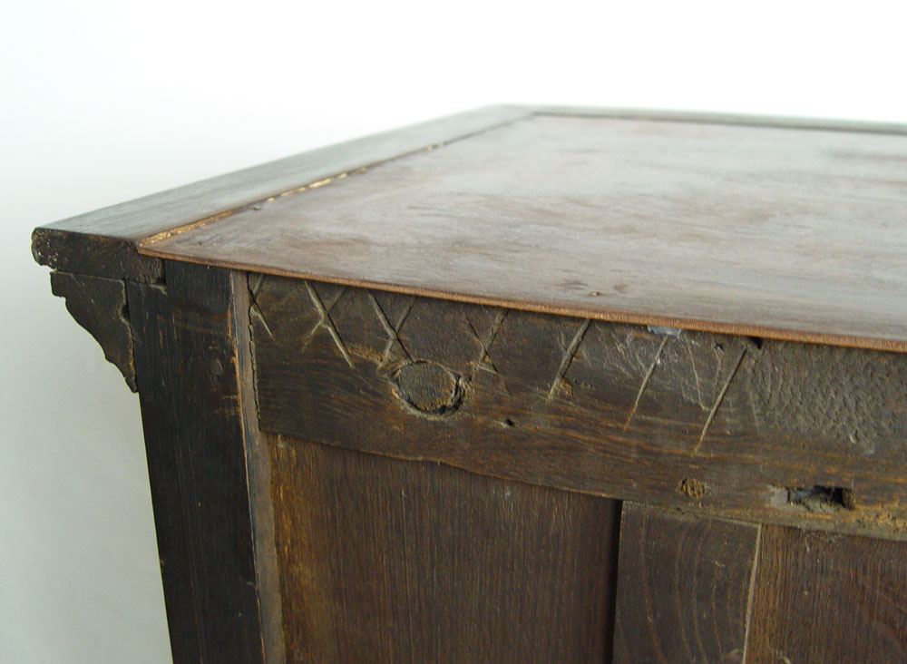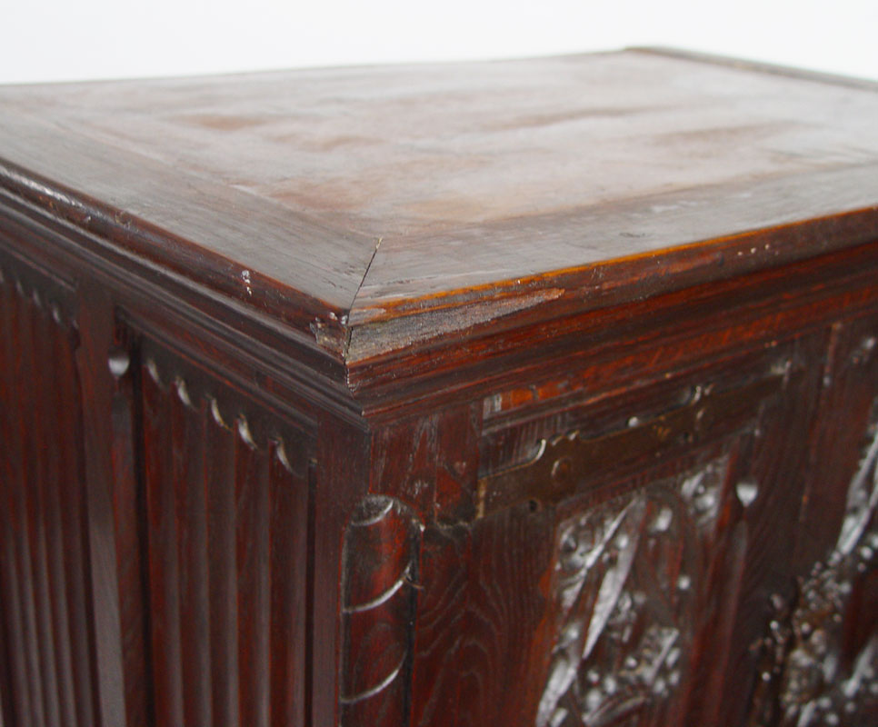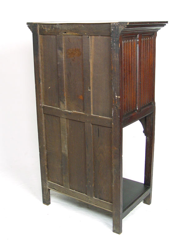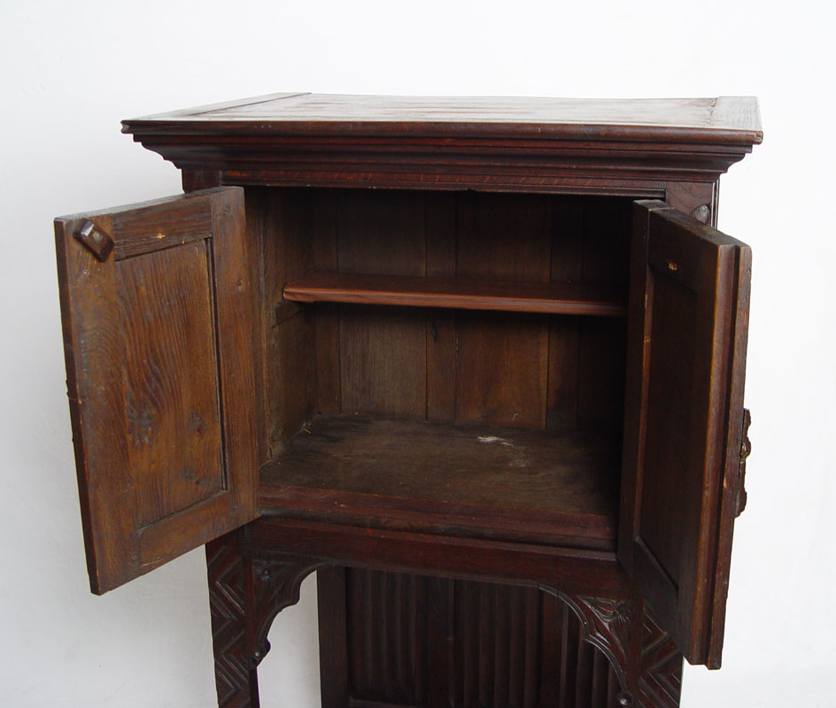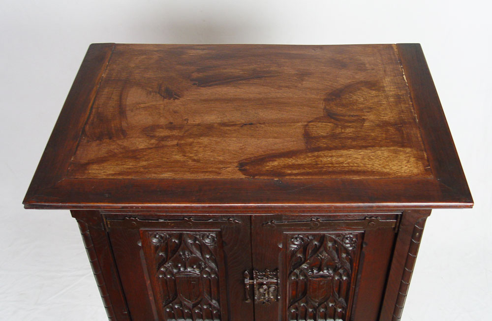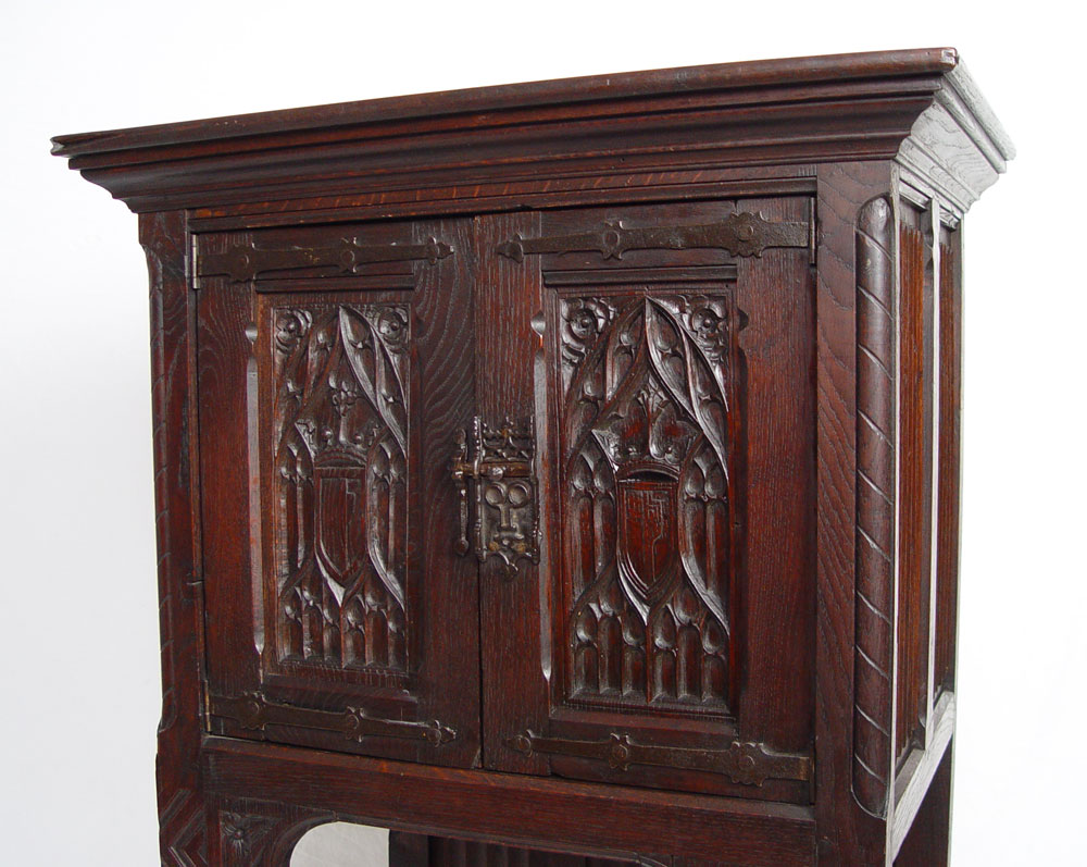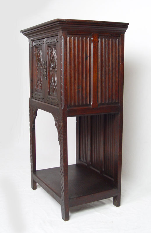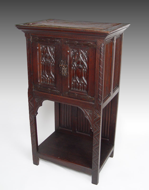 JACOBEAN STYLE GOTHIC OAK CABINET: 2 Door cabinet on carved legs with lower shelf, deep carved doors of gothic panels and heavy hinges and slide lock, 51''h. x 30''w. x 20''d.