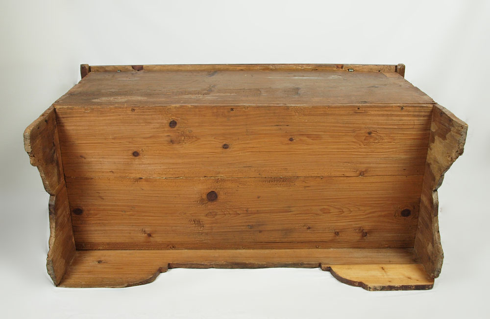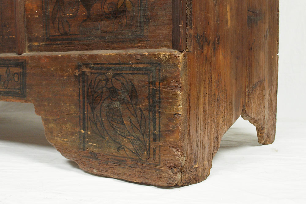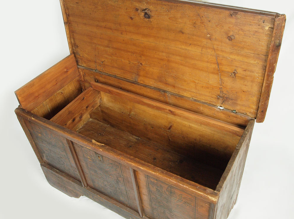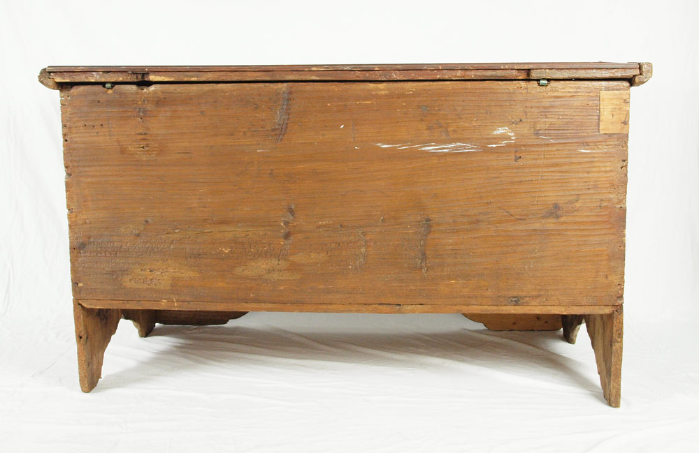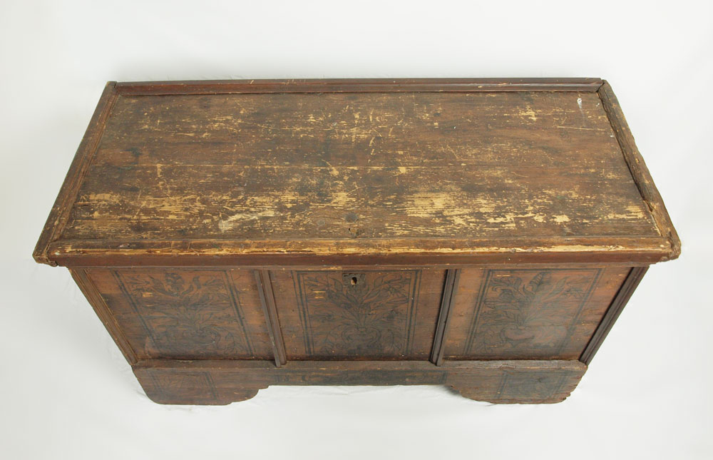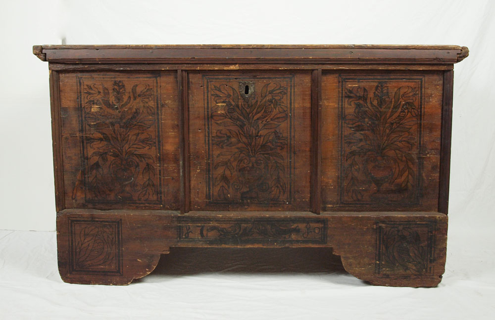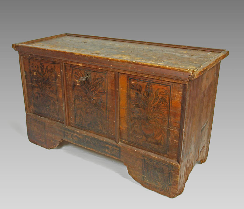 EARLY 19TH C PRIMITIVE DUTCH STORAGE CHEST: 3 paneled front with Dutch engravings, old replaced snipe hinges, bootjack ends and molded top, normal wear and replacement pieces over the years add to the charm, 35''h. x 62'' x 27.