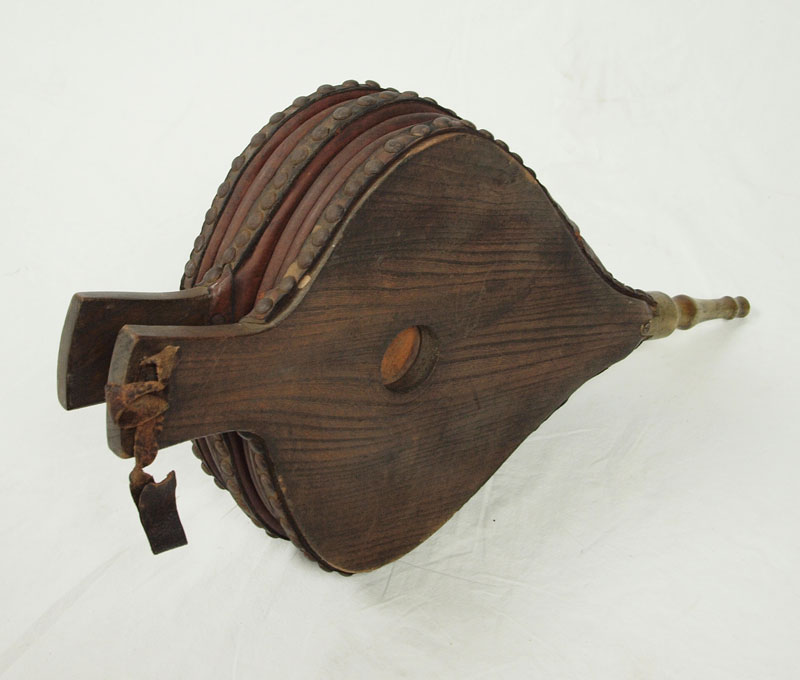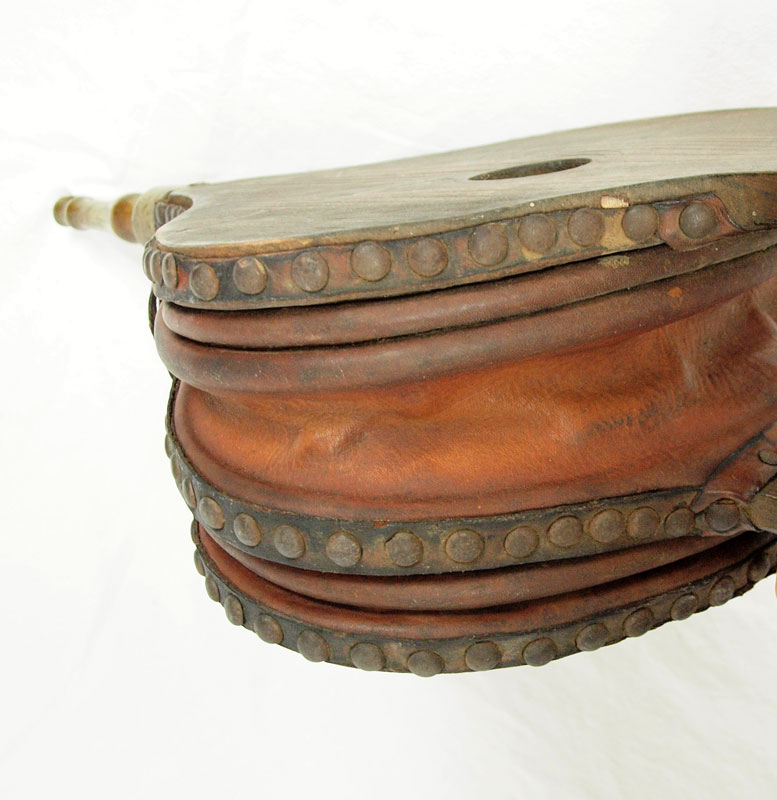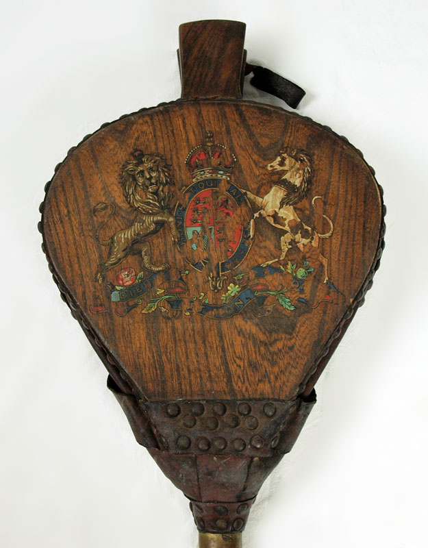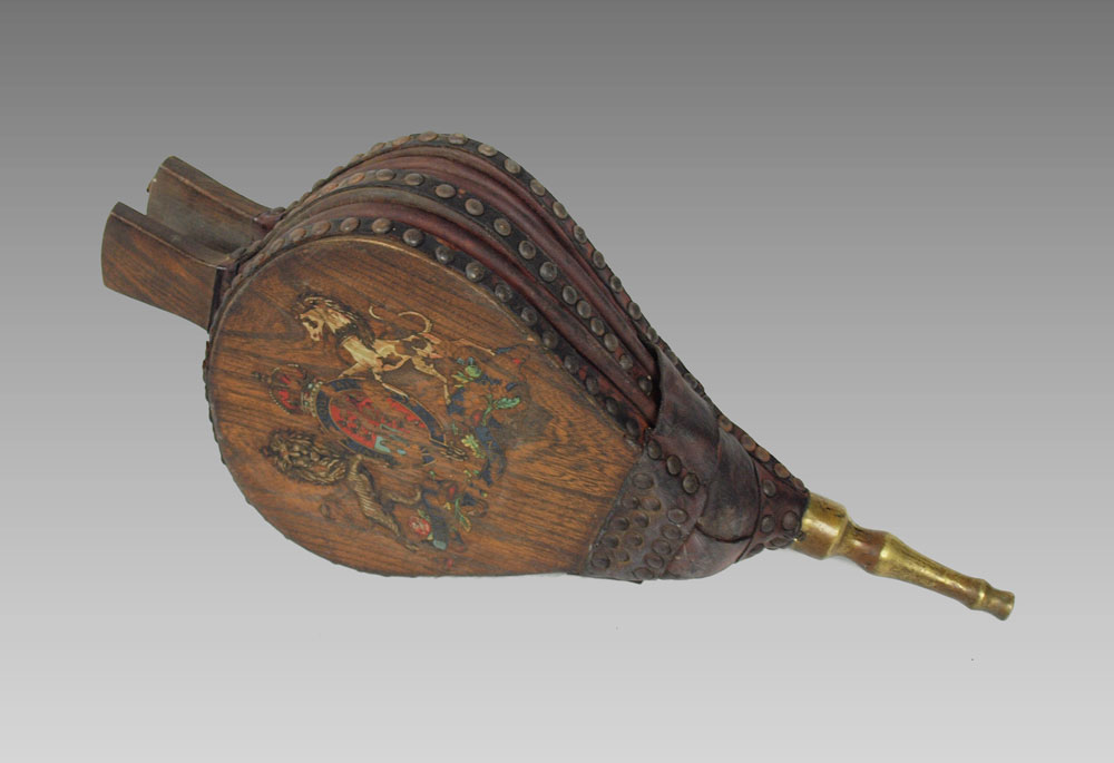 19th C HERALDIC HAND PAINTED WOOD BELLOWS: Functioning bellows decorated with coat of arms depicting the lion and unicorn. Wood, leather, and brass. 25'' long x 12'' wide.