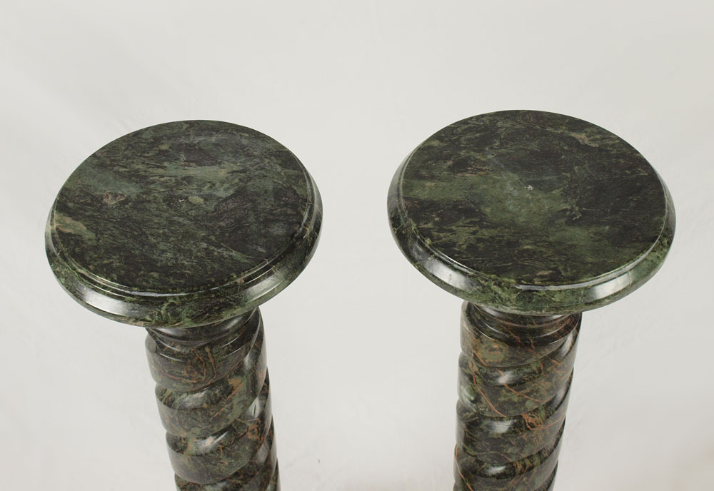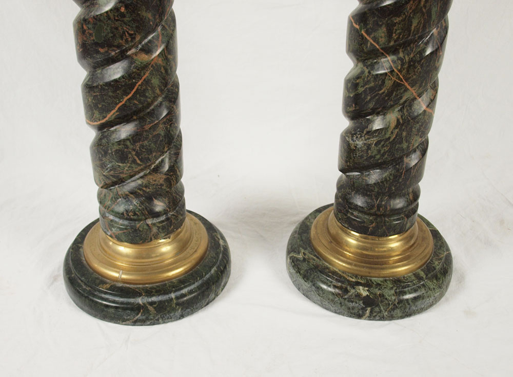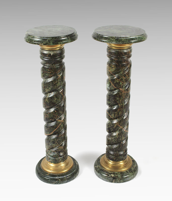 PAIR OF GREEN MARBLE PEDESTALS: Attached round molded top and bottom to carved twisted pedestals, trimmed with brass molding, 13''dia, 39''h.