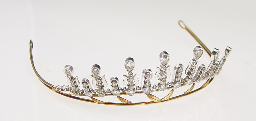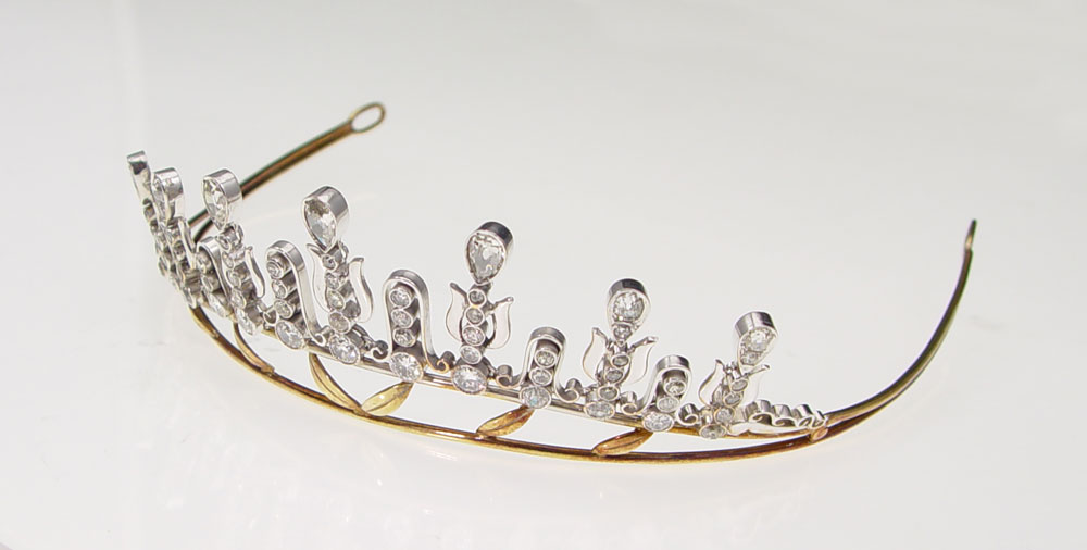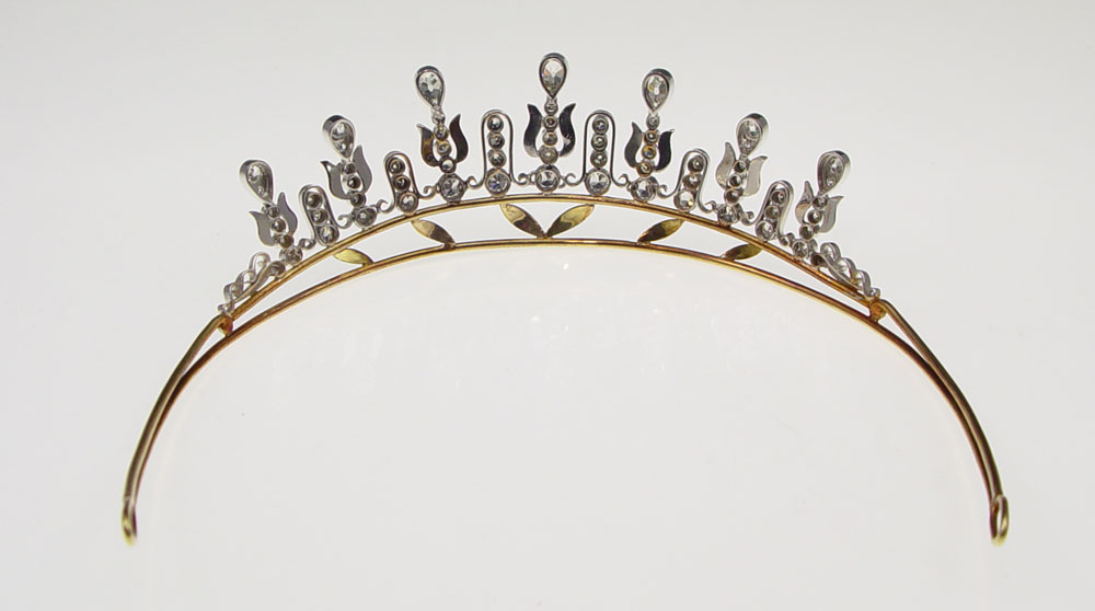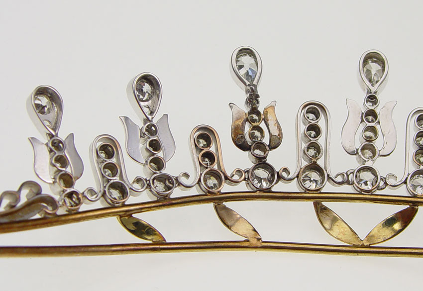 GOLD AND DIAMOND TIARA: 14K yellow and white gold diamond tiara contains fifty nine (59) old European round cut, round single cut and round brilliant cut diamonds. Three (3) early pear cut diamonds. Total weight approx. 4.50 Ct. The diamonds average VS-SI in clarity and I-M in color. The diamonds are bezel set. Weight: 38.3 grams.