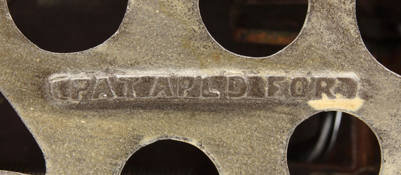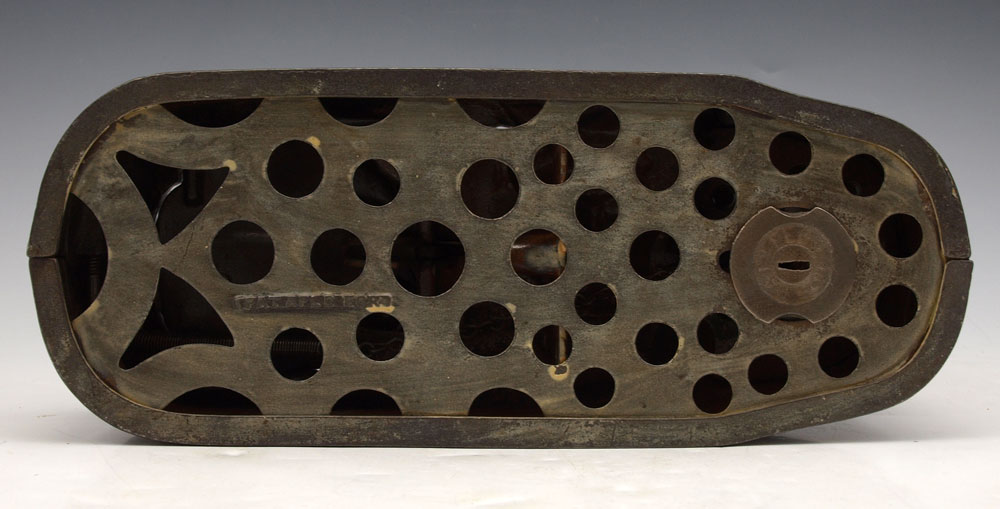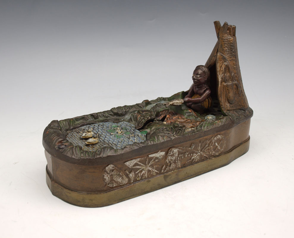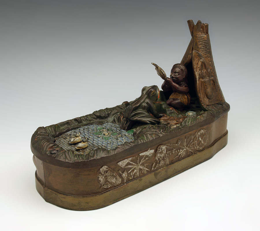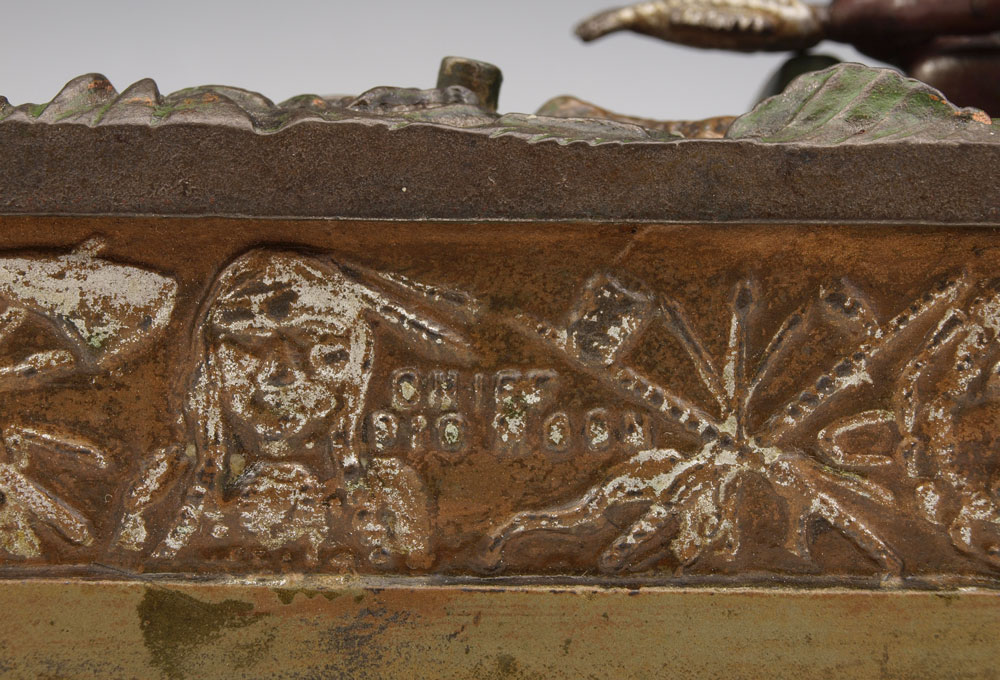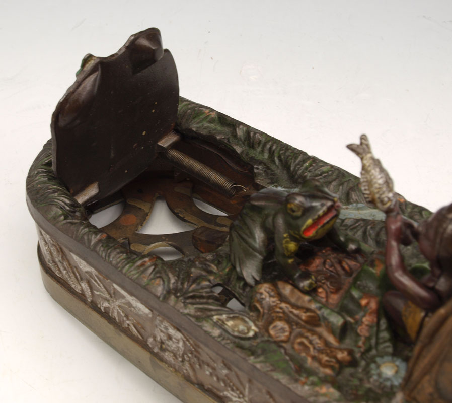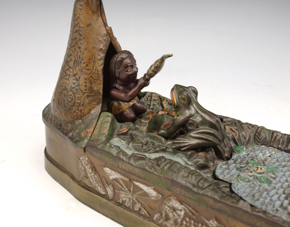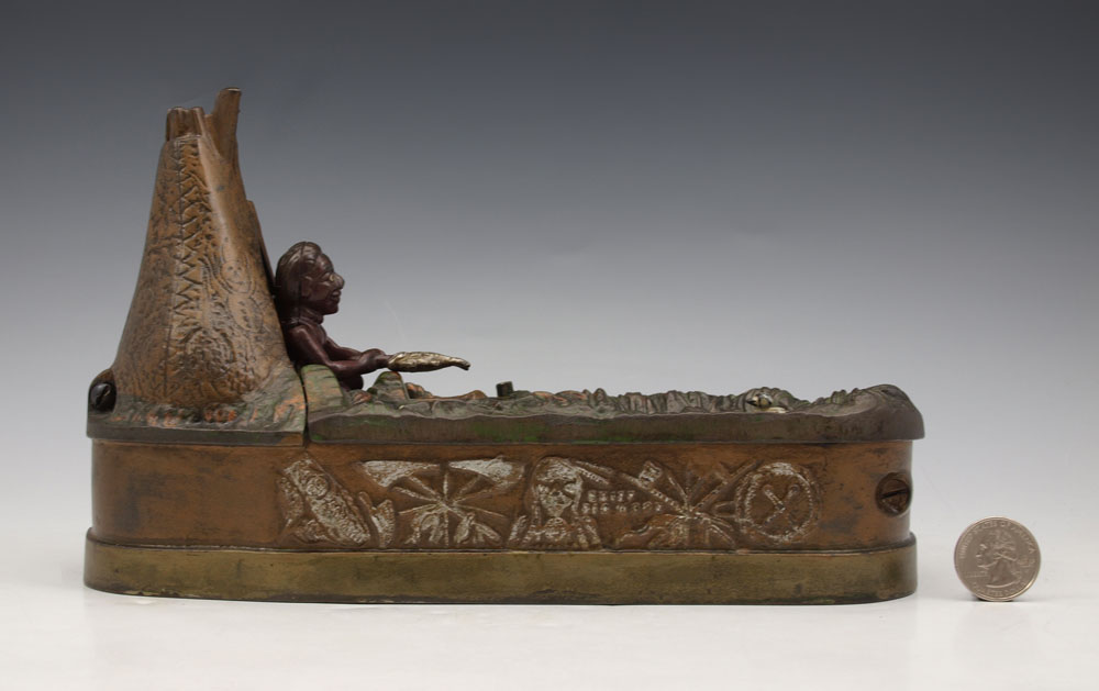 J.E. STEVENS CHIEF BIG MOON MECHANICAL BANK: Circa 1899. Cast iron, bronzed base with original paint. Coin is placed in slot, when button is pressed frog comes out of water to catch fish held by Native American, which he pulls up. Measures 6'' h. x 10 1/4'' x 4''.