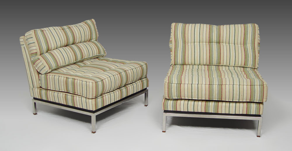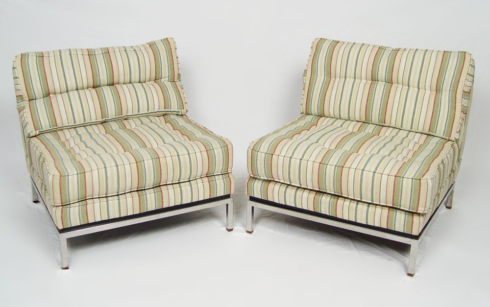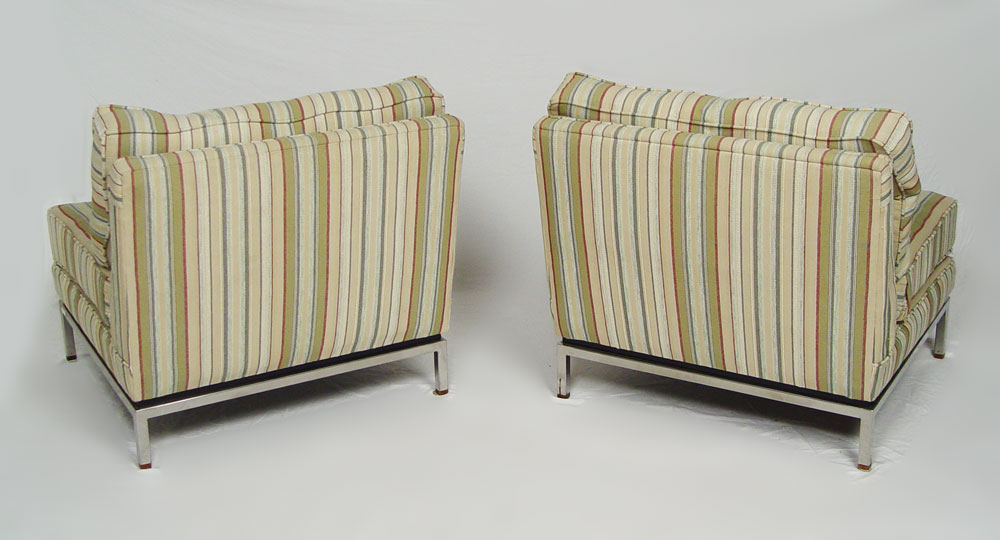 PAIR MID CENTURY DESIGN CHAIRS: Steel frame, upholstered in later fabric to match original. 30 1/2'' h. x 30 1/2'' x 34''.