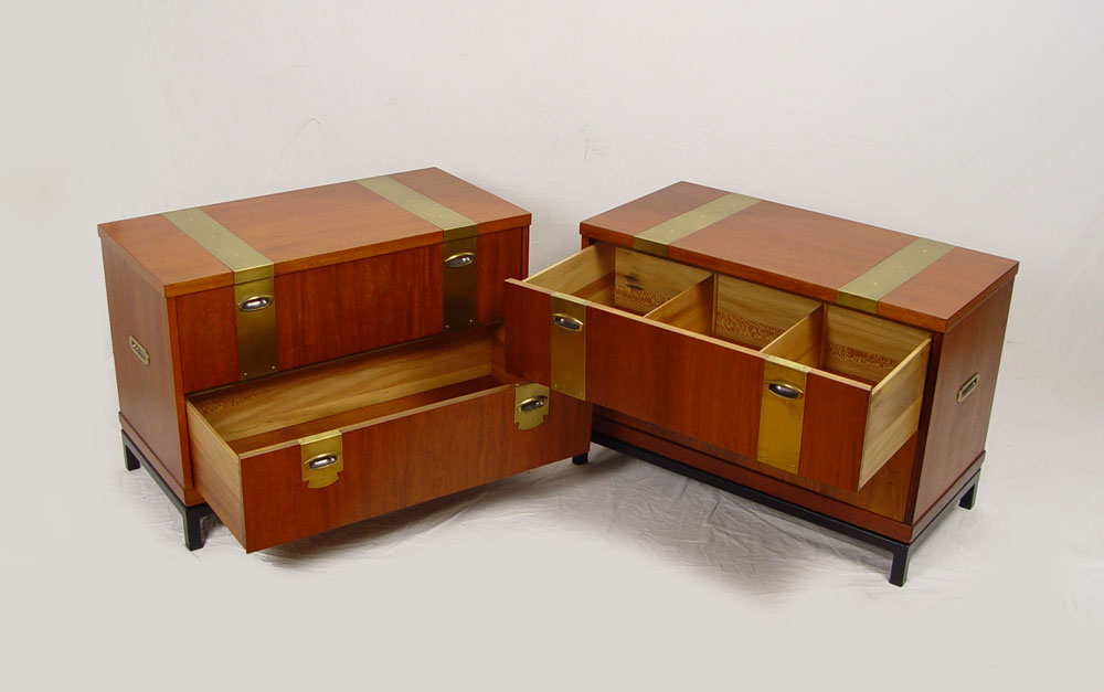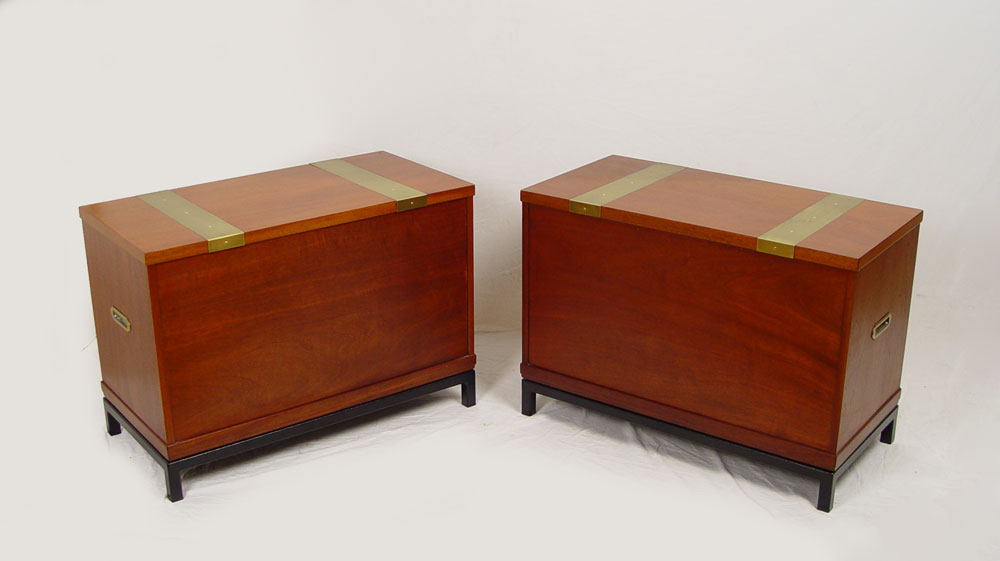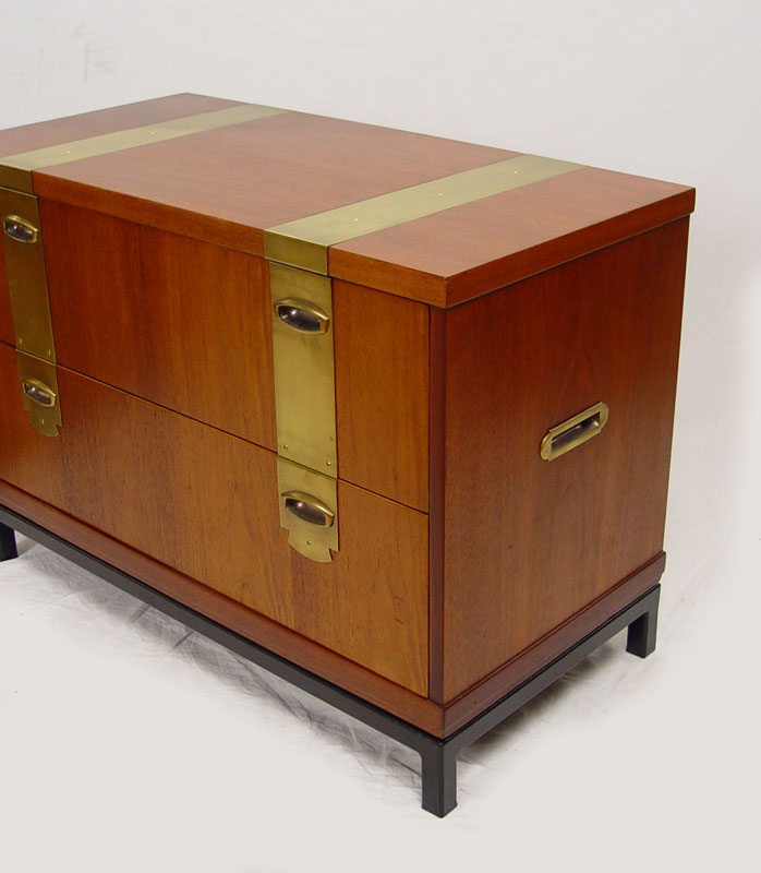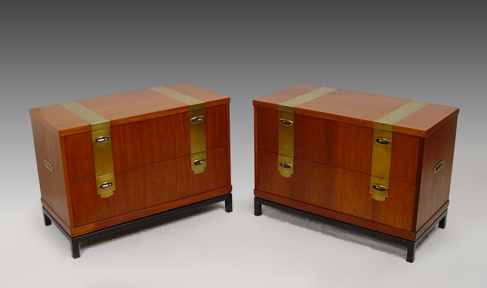 PAIR HENREDON CAMPAIGN STYLE CHESTS: 2 drawer with brass accents. Sit on black metal stands. Henredon stamp inside drawer. 20 1/2'' h. x 36'' x 18'' excluding stands. Stands 4 3/8'' h.